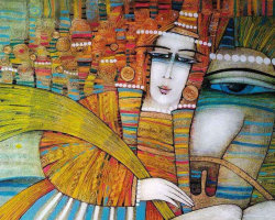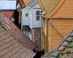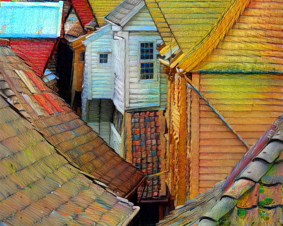 Once upon a time... rooftops in Bryggen Hanseatic Wharf, Bergen, Norway. Style is a crop of a painting by Albena Vacheva.