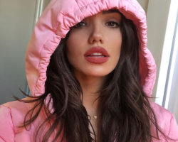 model wearing hoodie, pink & black