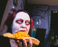 Me eating a well deserved slice of pizza after shooting a horror/comedy short all day. I was too hungry to take my makeup off first...haha! I probably ate some makeup. Style was made from 3 dreams & a photo of a corner of our livingroom.