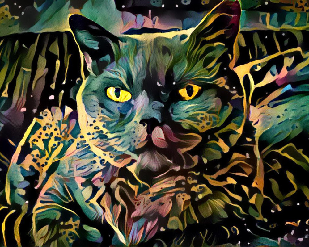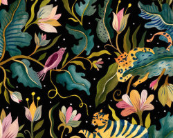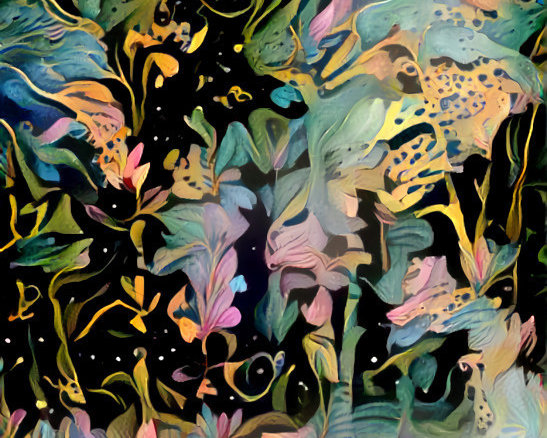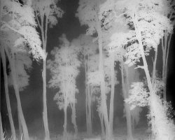 trees in rain & fog ~ black, bluegreen, gold, pink