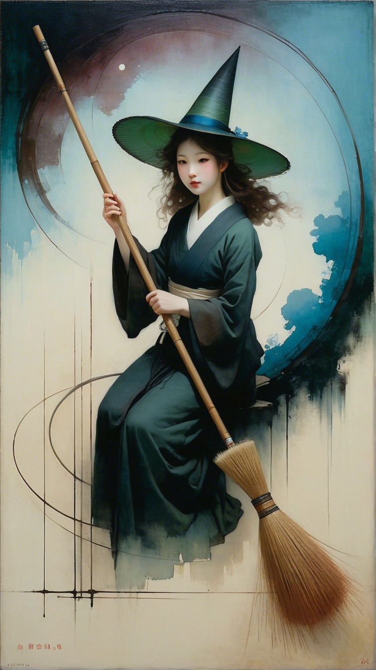 Full brilliantly coloured red, green, blue, brown. Artist Jean-Baptiste Monge style. The pale ultra-pale hyper-pale half body portrait, cute Kyoto witch girl wearing black robes and black witch hat, sitting & holding onto a broomstick as she flew off up to sides the right. Feathering, bleeding from indian ink, sketches of graph & waves, impasto oil painting, dark, abstract, ominous, style of Dave McKean and Stephen Gammell.