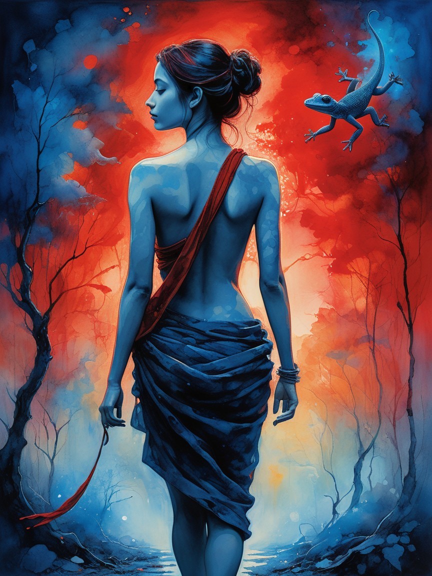 Prompt: solitary human figure, walking with a small gecko perched on her shoulder, surreal dreamscape, dramatic ink wash, unfamiliar texture, palette knife strokes, sacred nature, striking contrast, harmonious background, chaotic traces, red and blue light falling silently, magical realism, ethereal, hyper-detailed, intricate details, emotional connection, mysterious atmosphere, fine art quality, line work, deep lighting, by Esao Andrews, high resolution, ArtStation.