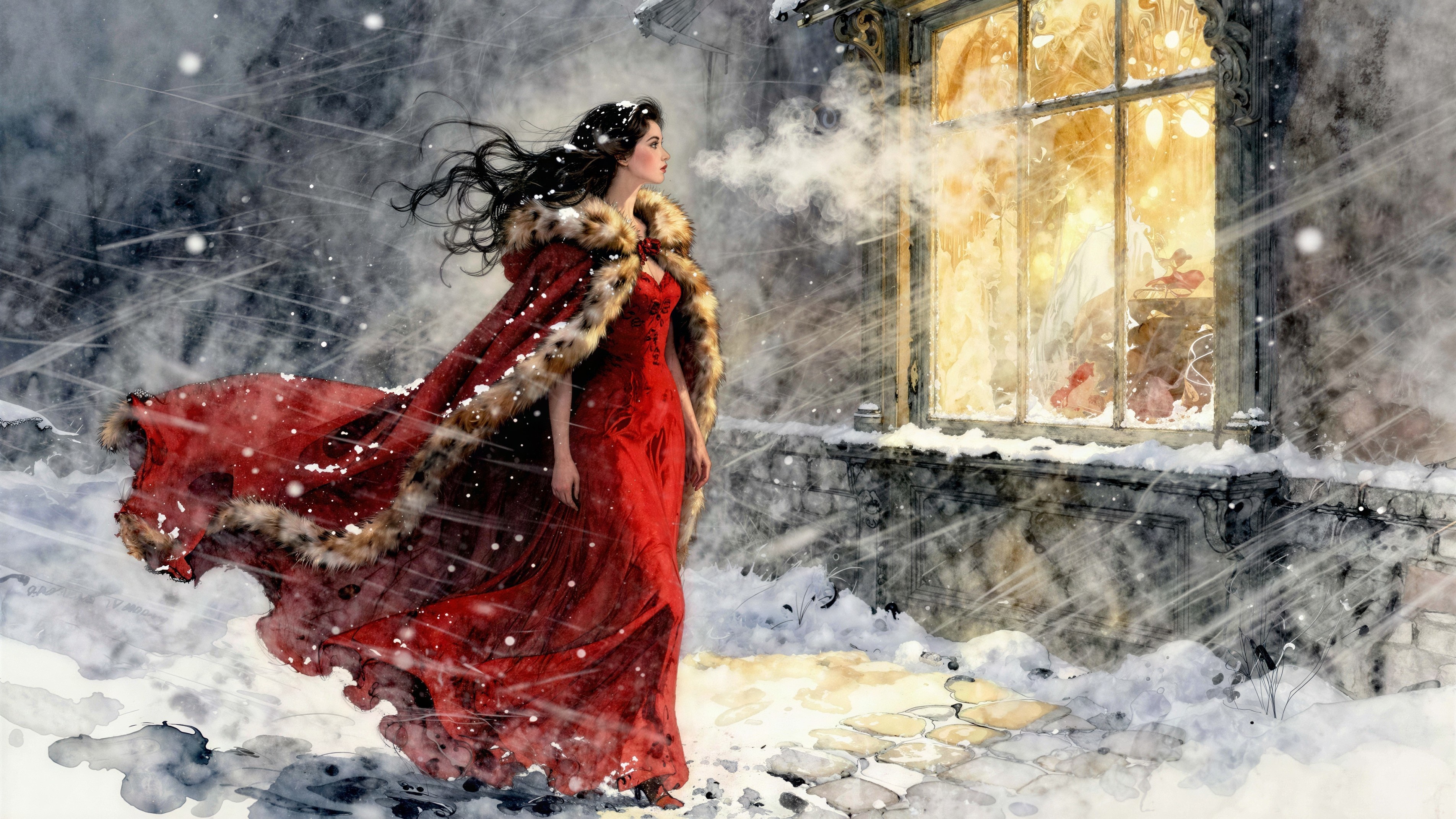 An elegant and beautiful woman stands resolute in a violent blizzard, ankle-deep in snow. She wears a flowing, figure-hugging crimson dress, over which is draped a heavy, long fur cloak. Both the cloak, her hair, and her dress are caught in a tempest, billowing and whipping violently in the fierce wind, creating complex, dynamic arcs in the air.