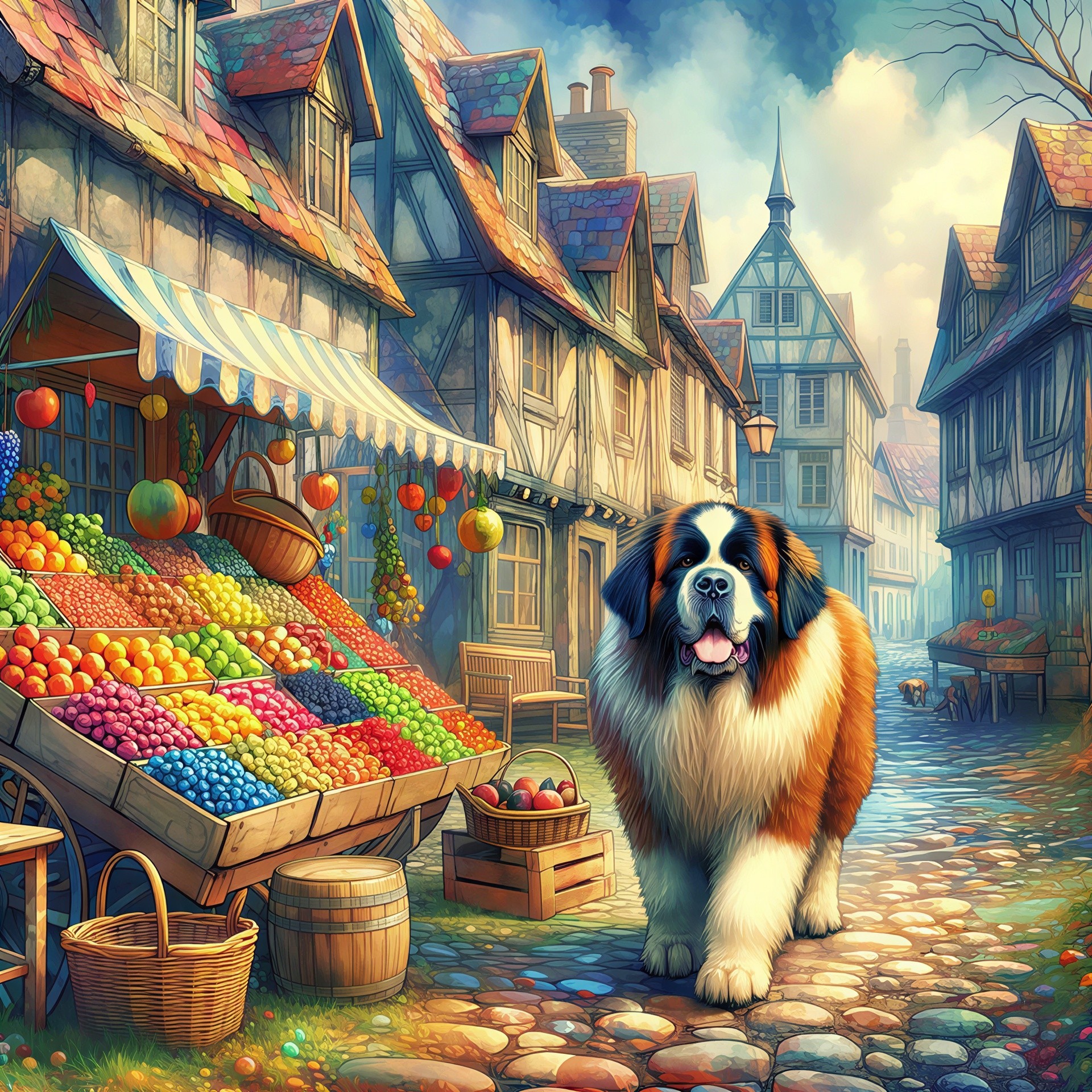 Prompt: A cobbled street lined with friendly, slightly crooked houses, warm and inviting. A small fruit stand bursting with colorful produce sits on the sidewalk. A burly, very fluffy Saint-Bernhard wanders smugly through the scene. Cheerful and lighthearted atmosphere. Very soft light.