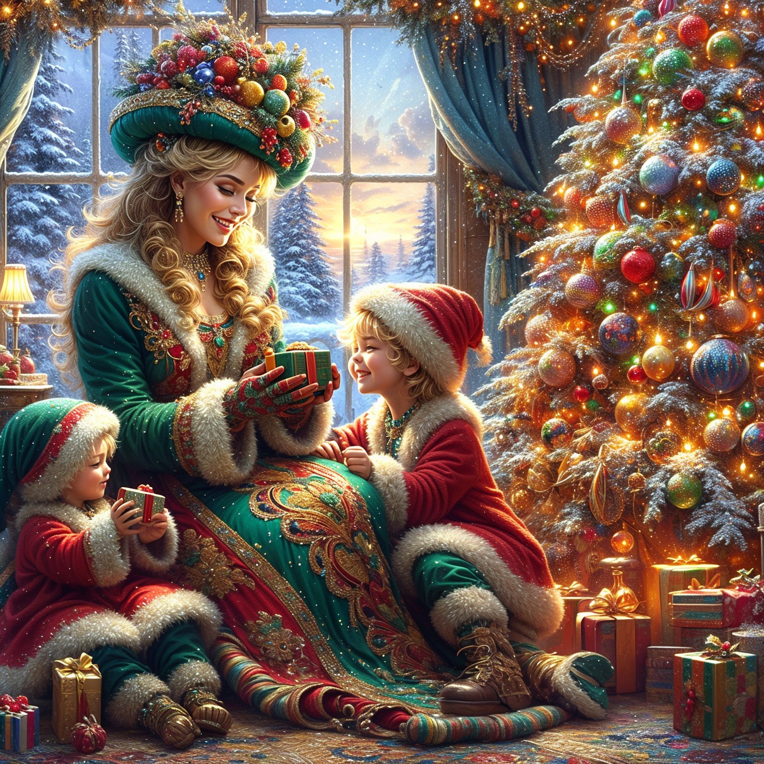 Prompt: A Christmas Mother theme, an expressive and festive impasto-style pastel painting combined with oil paints, featuring thick, snowy dotted textures. It depicts a close-up, full-length portrait of a joyfully smiling Mother Christmas, wearing a large green and red hat with shimmering white trim, flanked by two charming, slightly mischievous toddlers with blond curls. She lovingly offers them small gifts. The background shows the interior of a cozy living room decorated with a Christmas tree illuminated by sparkling baubles and garlands, with a large window in the distance offering a view of a magnificent snowy winter landscape.