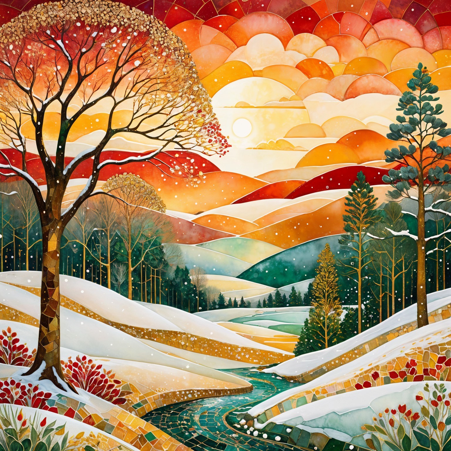 Prompt: A beautiful Winter landscape with snowfall, intricate floral patterns, shimmering gold accents, great golden sunset, mosaic patchwork background, soft watercolor textures, wet on wet technique, Klimt-inspired style, rich color palette of gold, red, and green, elegant and dreamy ambiance, Gustav Klimt's artistic flair, Artstation, high resolution for detailed brushwork and textures.