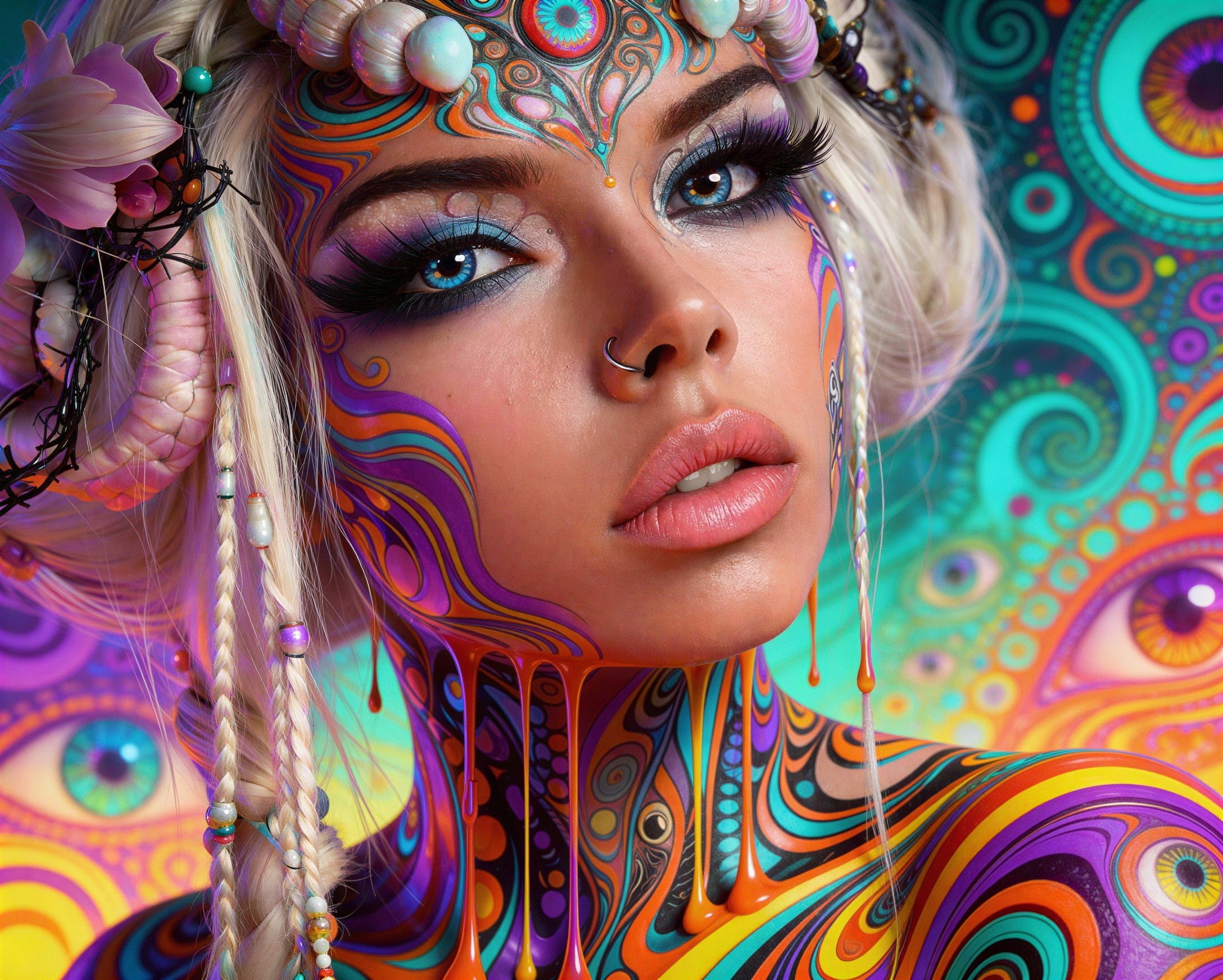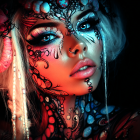 Zombie woman. Her face is heavily tattooed. Her hair is elaborately braided. A textured gradient of unearthly colors. Metallic vest with elaborate lacing. Soul party..Not plausible. Deep crimson. do you want to come too, my angel? then you come too my beauty and show me more of yourself.