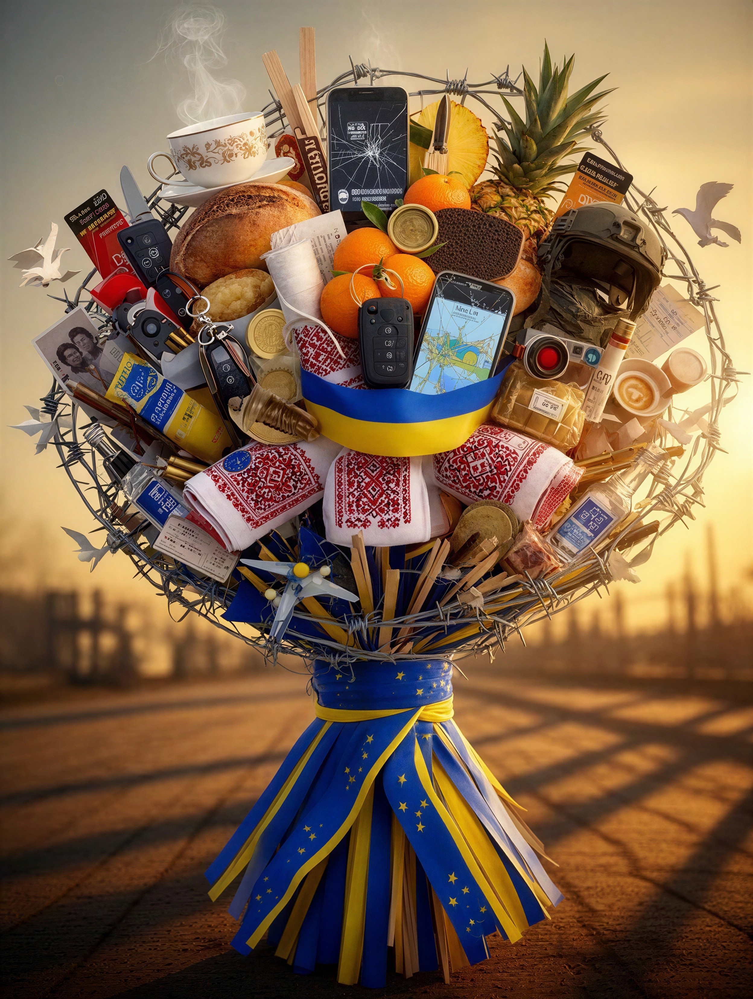 Objects protruding densely in all directions like abundant petals and fillers, creating a voluminous, rich, overflowing bouquet shape: steaming porcelain cup of herbal tea balanced carefully, fresh palyanytsya bread loaf, stale sliced black bread piece with hardened crust, whole mandarin oranges, fresh pineapple slice, smartphone showing peaceful Lviv street view, cracked smartphone displaying air raid alert, bicycle keychain, coffee shop loyalty card from Uzhhorod, luxury European car key fob, multiple energy bars in colorful wrappers, military-issue energy bars, rolled emergency bandage with faint red stains, CAT tourniquet in packaging, modern tactical combat knife with sheath, cluster of 5 spent .50 caliber bullet casings tied together, modern Ukrainian army tactical helmet with digital camouflage and tryzub patch, charred black-and-white family photo from a bombed home, scorched child's drawing fragment, power bank with taped cracks, miniature air raid siren, shattered church stained-glass piece, horilka bottle miniature, traditional rushnyk towel fragment with red-black embroidery, embroidered bookmark with folk pattern, varenyky dumpling mold, salo wrapper, euro coin medallion, high-speed train ticket to Warsaw, miniature Schengen visa stamp replica, Brussels chocolate wrapper, EU flag pin, small espresso cup, FPV drone propeller fragment, kevlar glove snippet, wooden splints bundle, folded Donbas trenches map printout, military ration pack wrapper with handwritten motivational script.