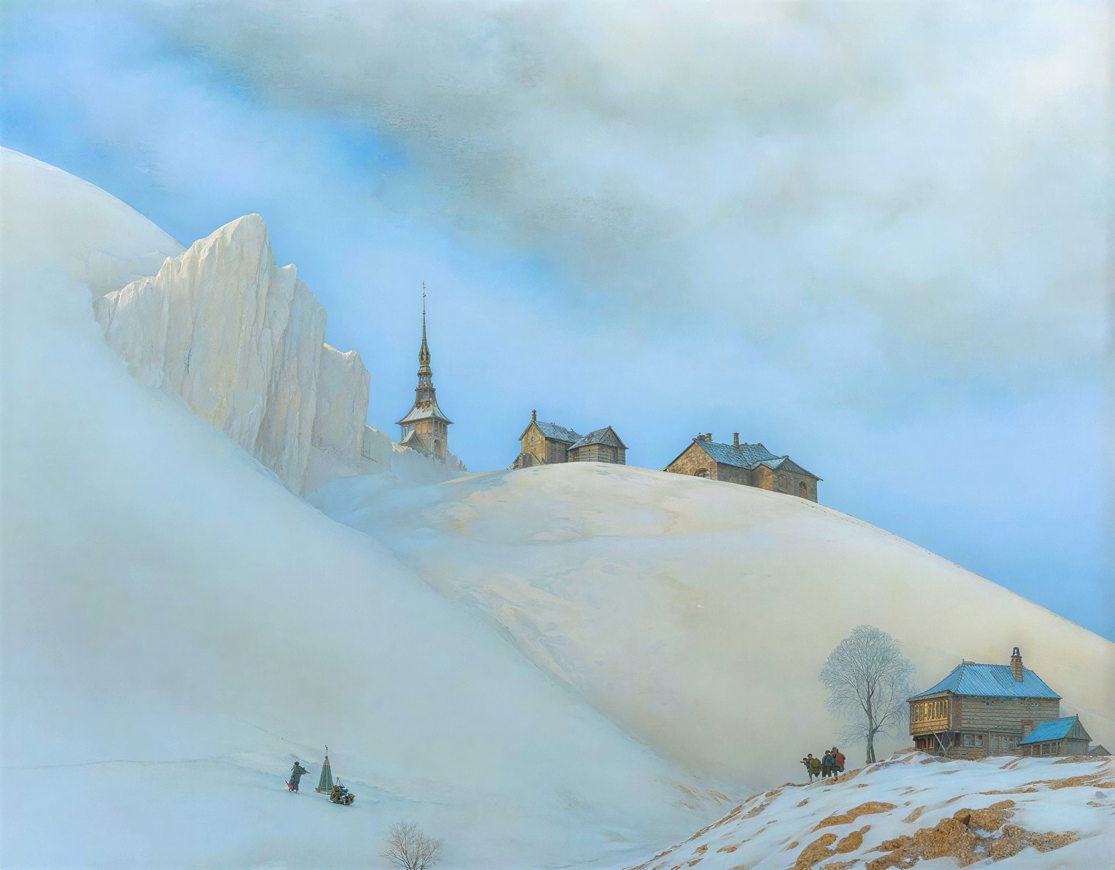 Prompt: Settlement in a frozen wasteland. Clarify figures and building detail with Anton Pieck. Soften sky with Apollinary Mikhailovich Vasnetsov. Retain vivid color saturation.