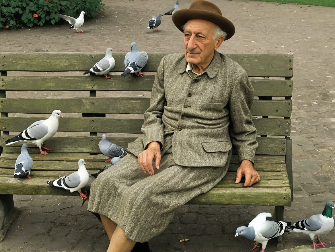 A young woman with long, tousled hair is the focal point, her form defined by flowing, expressive key block lines. She wears a casual t-shirt and colorful skirt, depicted in flat, solid planes of soft indigo and warm coral, while her knee-high socks feature rainbow stripes as bold, precise bands of color. She stands on a dilapidated balcony surrounded by potted plants and vibrant flowers, rendered with intricate, organic carving in emerald green and floral pinks. A flock of pigeons gathers around her, some perched on the railing and others soaring, etched with fine, delicate lines to capture their movement. The background features old brick buildings, suggested by a grid of cross-hatched and stippled textures in muted ochre and grey, adding a sense of urban decay. The atmosphere is ethereal, with soft, diffused light filtering through the scene, represented by areas of untouched, warm paper against the deeper, inked shadows of the cityscape. The overall palette is a harmony of soft pastels and muted urban tones, with an emphasis on translucent layering and delicate detail. The mood is one of wistful solitude and quiet beauty, balancing graphic boldness with a sense of dreamlike intimacy. Ukiyo-e, woodcut, linocut, key block, bold outlines, flat colors, stippling, intricate, atmospheric, high-contrast, textured, stylistic, nostalgic.