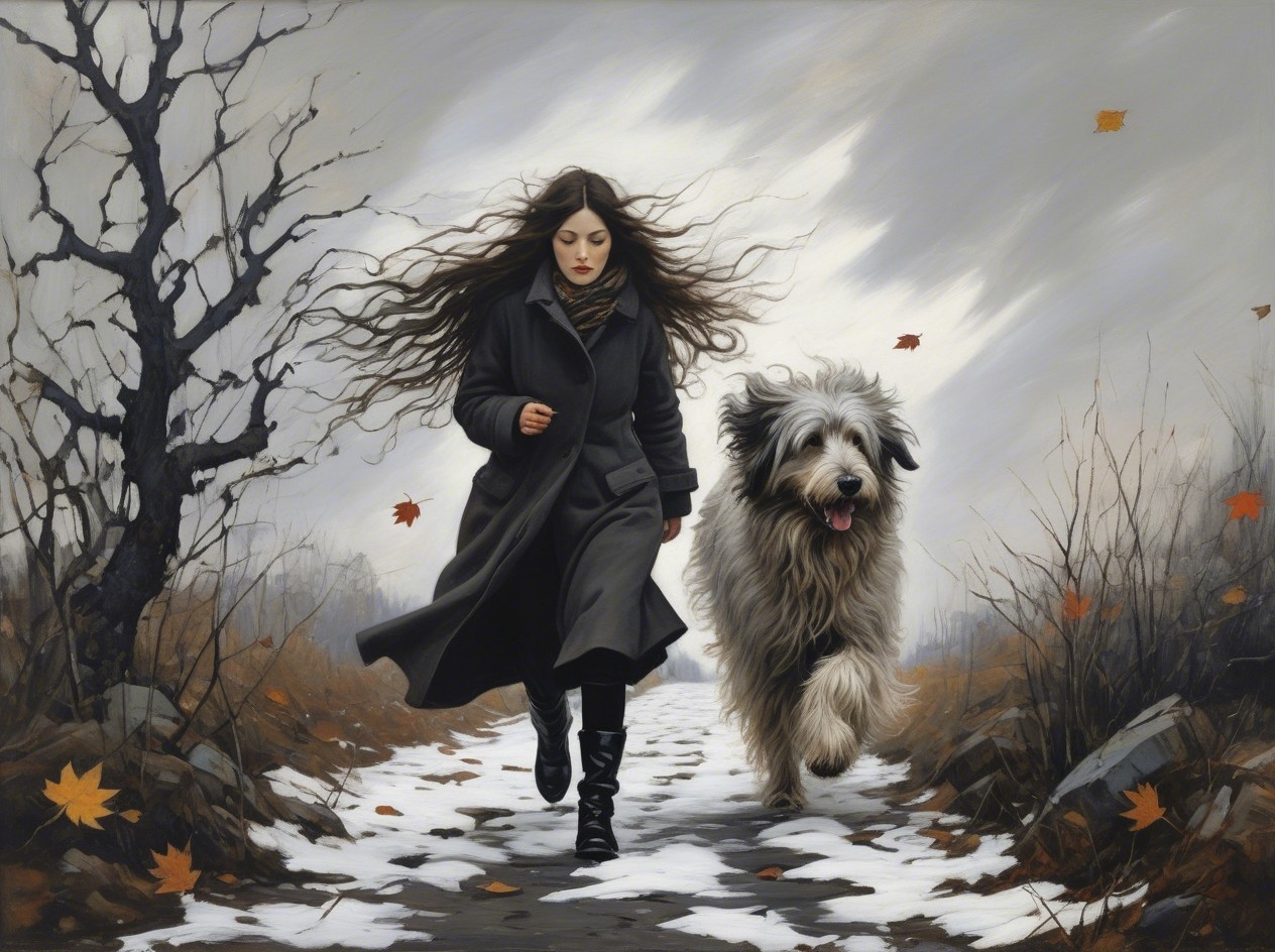 Prompt: One woman with long hair in cold weather clothing, one shaggy dog, walking, with their long hair blown about by wind; grey winds, autumn leaves, bare branches, blustery atmosphere; neo-expressionism and pop art