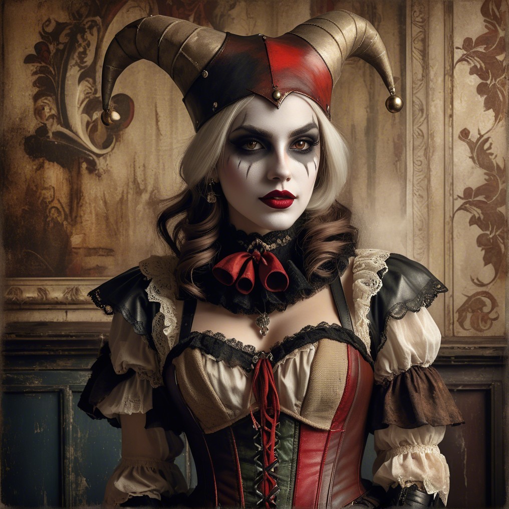 Prompt: Digital painting of a gothic harlequin woman: pale white makeup with dark smoky eyes and red lips, wearing a two-horned jester hat with bells, a weathered brown corset, leather bracers, and a tattered skirt with shredded fabrics. Layered textures of leather, lace, and burlap. She stands in a dim, antique room with ornate wallpaper, 3/4 view, slight head tilt, haunting, theatrical gaze. Color palette of earthy browns, beiges, and muted greens; moody chiaroscuro lighting with soft, cinematic glow. Ultra-detailed, high-resolution, photorealistic digital painting style.
