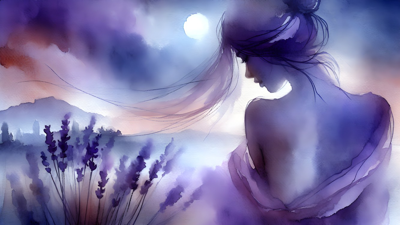 Prompt: Lavender mist rolling...Her hair weaves songs of night...Dreams dripping moonlight...