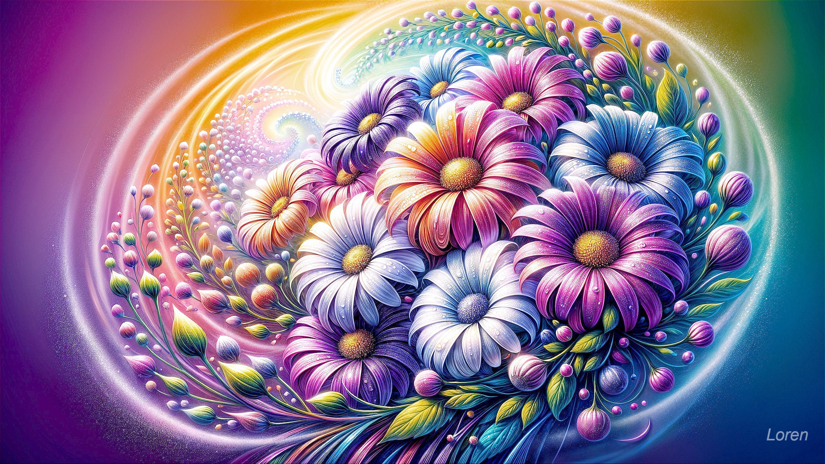 Prompt: not (patterns, text) Vibrant Swirl of daisy flowers: A Dance of Colorful Energy A vibrant swirl of colors creates a captivating abstract design. Rich reds, blues, yellows, and greens intertwine with white daisy flowers, evoking a sense of energy and movement. Masterpiece. Extremely detailed. A masterpiece of pastel graphics