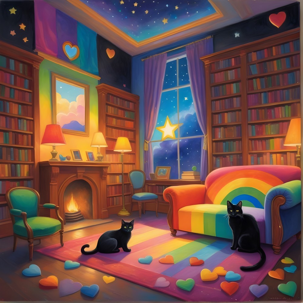 Prompt: Please draw a small rainbow-colored Pride flag in the corner of a colorful old-timey library with a black cat curled up on a couch. Happiness and love, expressive colorful sketch, tiny rainbow colored hearts flow all around, a peace sign and many bright stars illuminate the sky outside the library window.