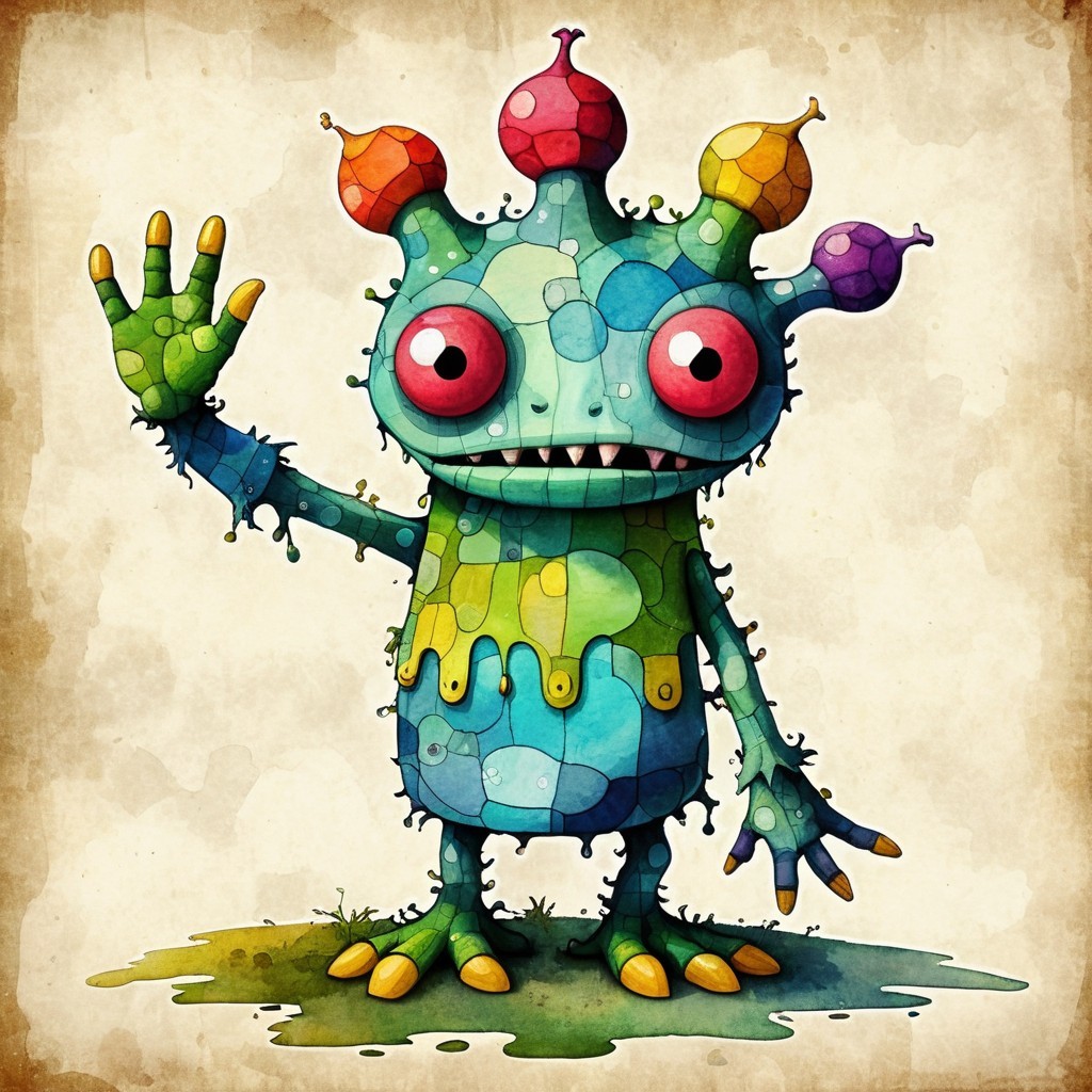 Prompt: [totally blind, Wutdafakizdiz in Monsterpalooza ?? ( Lumpy Happy Tree Friends ) generated and shaped as hand-palm creature as a distorted drollery creature from a medieval bestiary, twisted in shape, with vibrant, naive watercolor minimalist patchwork abstract hyperrealistically textures, blending psychedelic biomechanical elements, inspired by Wifredo Lam and Bernard Kliban Philharmonia Fantastique {100 Strokes of the Brush by Morris Louis Alpha-Phi (1961) Tate, by Anna Silivonchik & Sam Toft & Stewart Edmondson} in a schematic, minimalist bloody illusion]