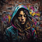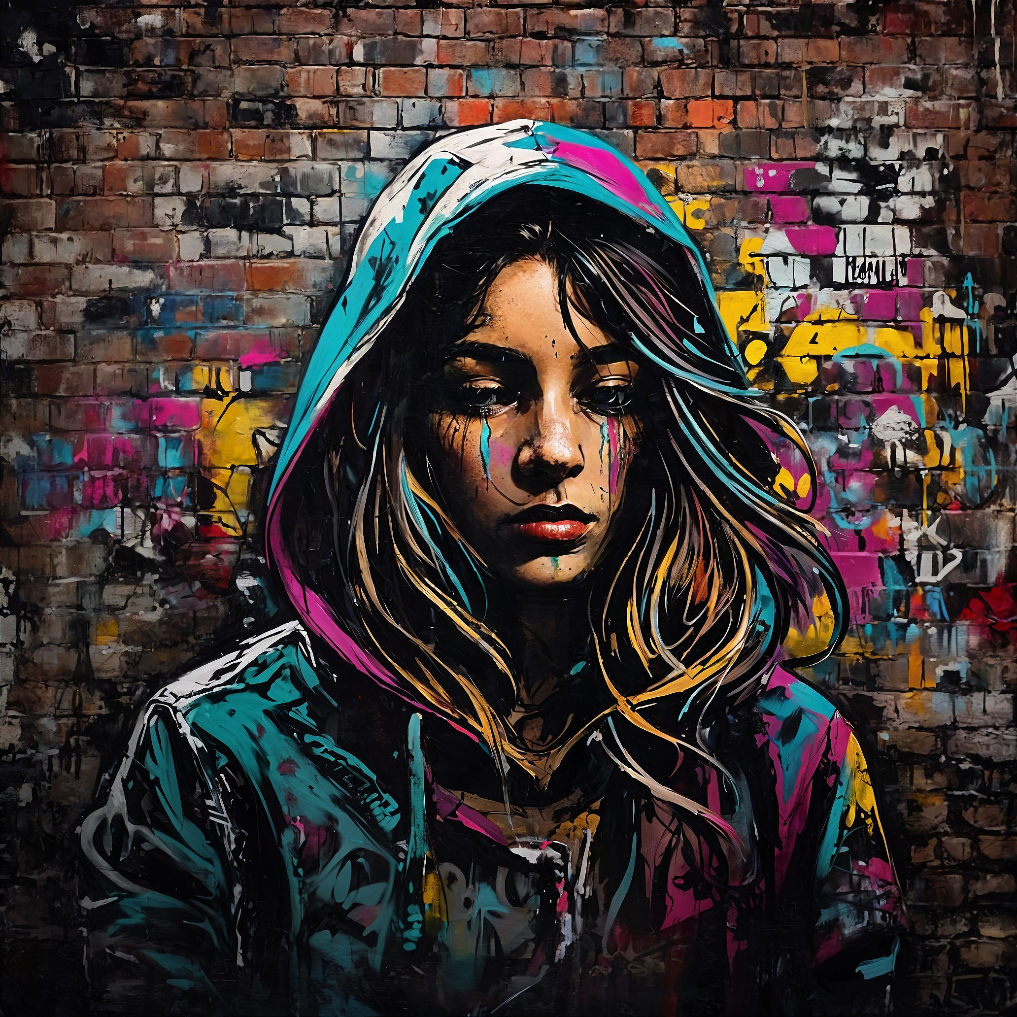 Prompt: Portrait d’une jeune femme en gros plan, debout devant un mur de briques couvert de graffiti colorés. Style fusion Pop Art et Banksy : contours épais et nets, effets de pochoir, textures de peinture en spray, éclaboussures vibrantes. La femme porte un sweat à capuche turquoise et rose, abaissé sur son visage. Expression mélancolique, yeux fermés, traces de peinture qui coulent sous les yeux comme des larmes. Cheveux longs, légèrement ondulés, mêlant des tons naturels et des touches colorées inspirées du street art. Arrière-plan très urbain, saturé de tags et de motifs graffiti en magenta, jaune, cyan et noir. Ambiance sombre mais graphiquement intense, contraste marqué entre ombres profondes et couleurs éclatantes. Composition frontale forte, éclairage dramatique mettant en valeur le visage. Style pop urbain, grunge, pochoir, mural.