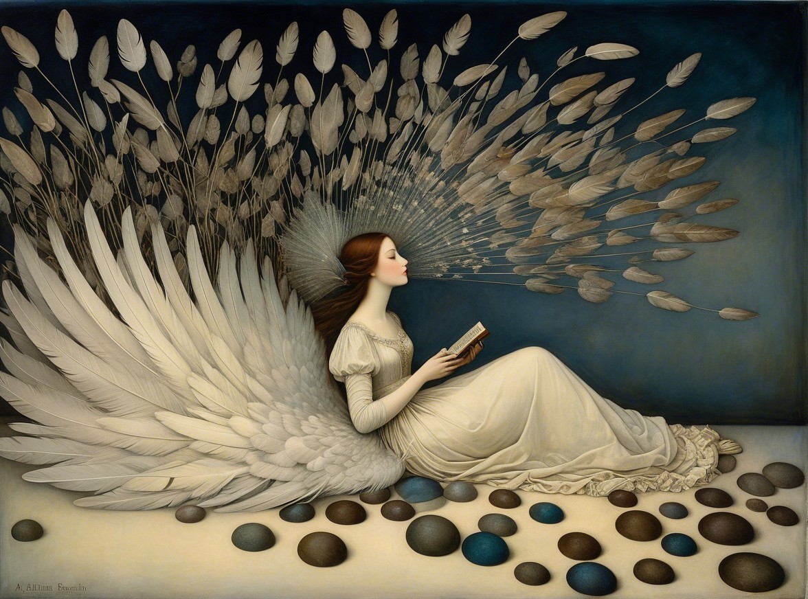 Prompt: A masterpiece of fantasy realism. A hybrid of a peacock with a beautiful, vibrant tail and a golden penguin poses on a rocky beach with multicolored stones in shades of purple and gray.