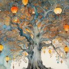 Prompt: A captivating scene features graceful heavenly Cherubim floating above a Jacaranda tree. The Cherubim has four wings. A creek runs next to the tree with floating leaves and colorful wildflowers. Whimsical wind shakes the branch at fullmoon, casting a solf glow on the violet flowers, while falling flowers create beautiful watercolor orbs and sprites.