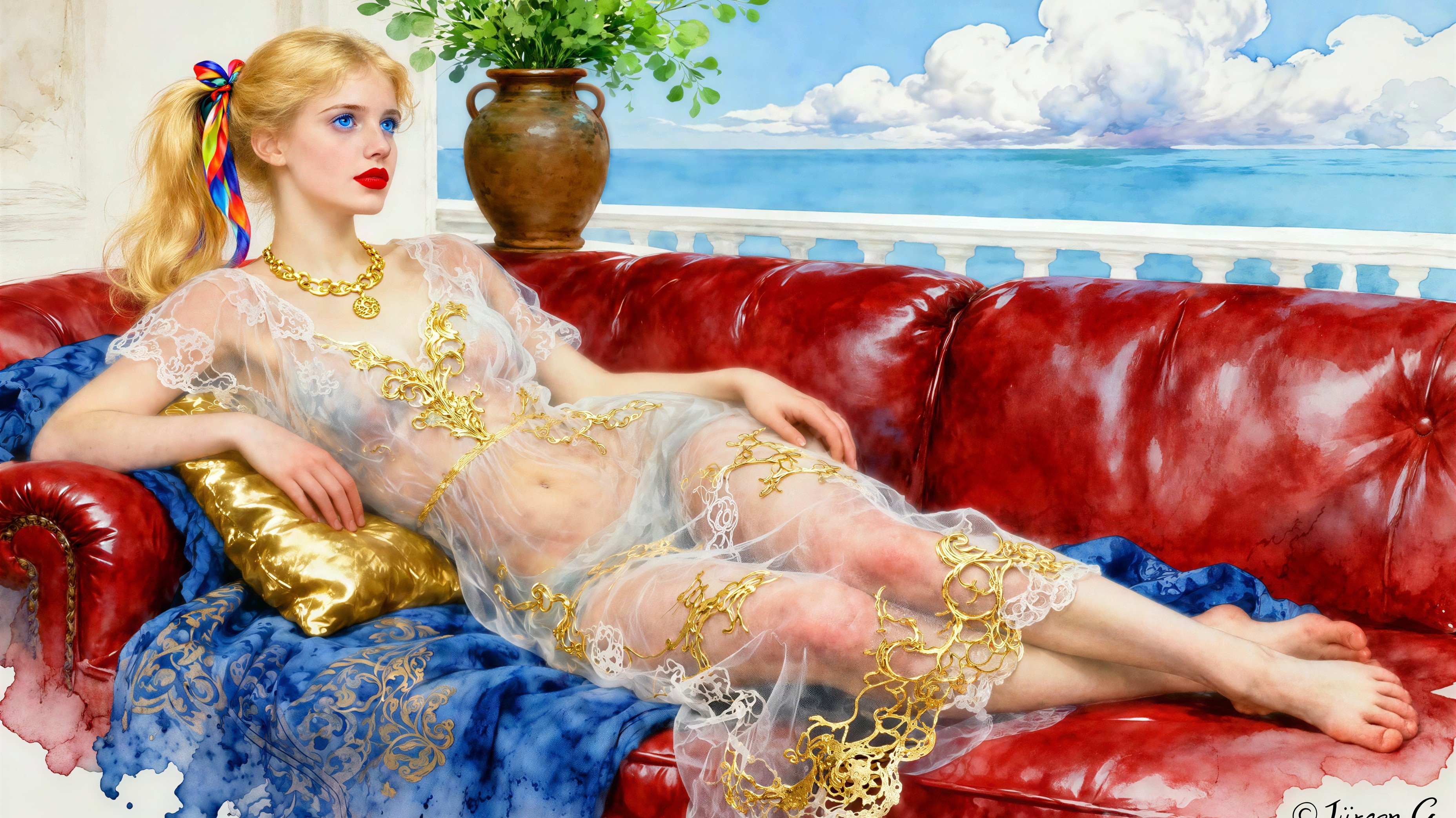 Prompt: A serene young woman reclines barefoot at full-length on a plush red leather couch, her blonde ponytail adorned with a pop of color as the golden threads of her sheer lace dress glimmer beneath the soft light. A gold necklace sparkles against her piercing blue eyes and deep red lips. In this John William Waterhouse-meets-Josephine Wall-inspired masterpiece, the subject's sensuality is amplified by the inviting atmosphere. The couch's patterned blue blanket and matching gold pillow create a warm ambiance, while the brown vase with greenery behind her adds natural contrast. Beyond the white railing, a serene body of water stretches out, meeting the gentle sky's soft blue hue and fluffy white clouds. Watercolor washes blend with alcohol ink techniques by Steve Hanks.