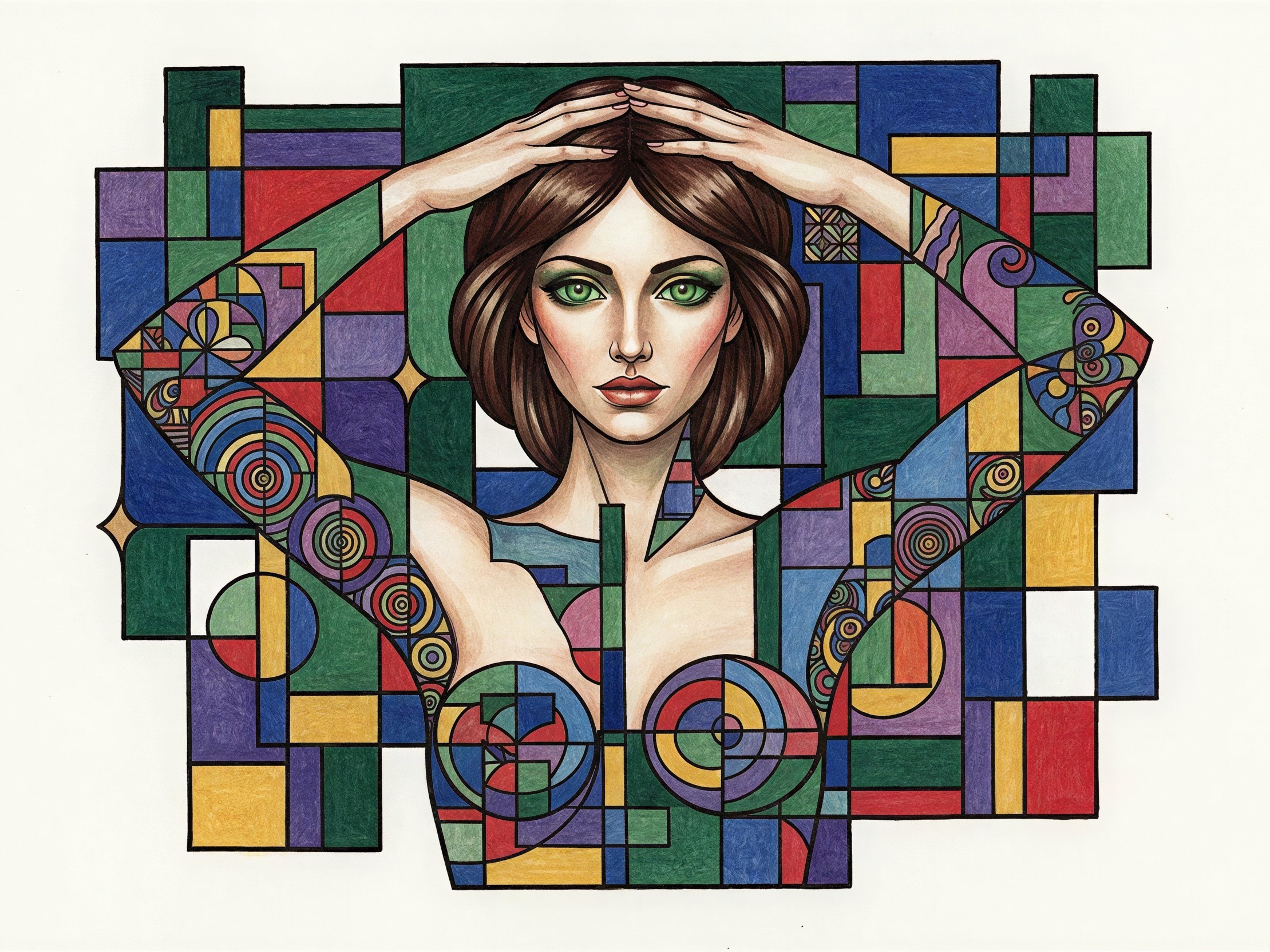 Prompt: Beautiful young brunette woman sensual green eyes posing with arms touching head. abstract cubism drawing. Style M. C. Escher and Wassily Kandinsky and Kazimir Malevich