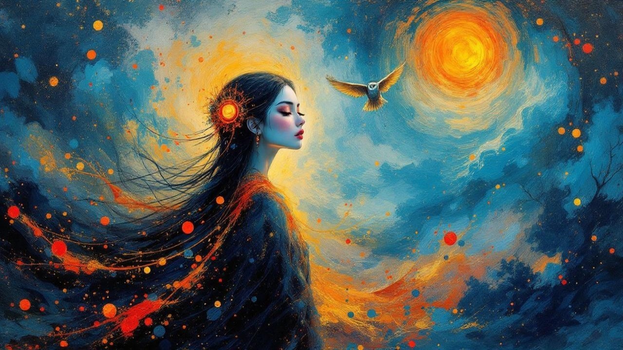 Prompt: Mesmerizing evocative dreamy oil painting, expressive hard brush strokes, textured oil on canvas, dynamic paint splashes, drifting paint splatters, thick palette knife technique reminiscent of Mona Edulesco, evoking the iconic style of Van Gogh, winter cold dark muted desaturated colours, intricate details, bold and confident EmmAI composition, masterful blending of sad colours, intense emotion, dramatic lighting. An ethereal beautiful mystical East Asian woman with flowing dark hair, wearing a vibrant orange and gold circular headdress. Her skin is pale and her makeup features striking blue accents. The background should be a dreamlike landscape with swirling patterns in shades of blue and orange, dotted with ethereal celestial elements like suns and moons. Incorporate abstract trees in the distance and a large, watchful owl in the sky, enhancing the atmosphere of mystery and magic. The whimsical style should be reminiscent of modern fantasy art, rich in intricate details and vivid colors.