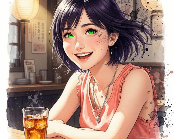 Prompt: Masterpiece Waltercolor,ink and pen, alcohol wash, dreamlike, pastels, /\She savors the sweet taste of a honey pie, a slice of Napoleon cake, and For drink, Sophie ordered tropical fruit tea (. Sophie, an attractive, slender 18-year-old, wears pearl drop earrings. софи в лаундж кафе сидит на уютном бархатном зелёном диванчике, и наслаждается видом на большой город с его архитектурой. На ней черный бархатный жакет и брюки, волнистые серебристые волосы собраны в небрежный пучок на макушке На столике у софи десерт медовик и стекляный чайник с чаем. За окном идёт снег, машины, и звёздное небо.