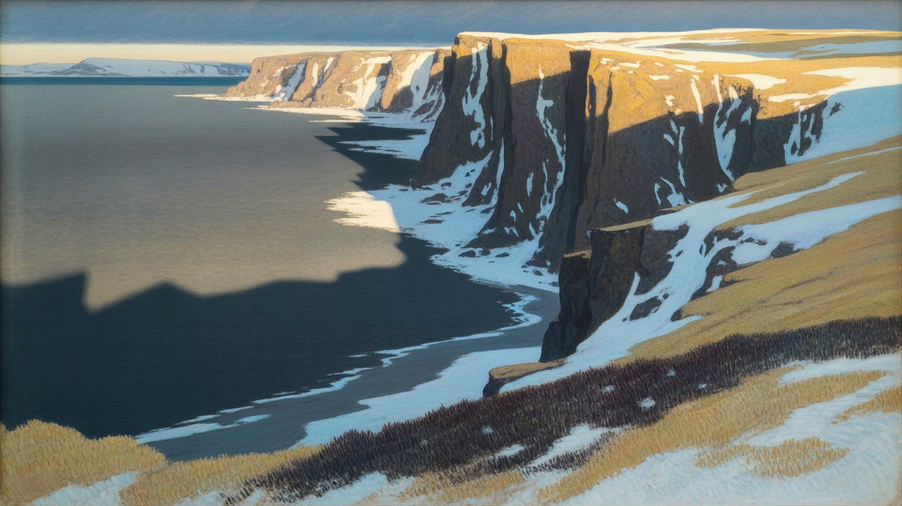 Prompt: a Pointillist semi-abstract oil painting in high contrast bold colors of an Arctic landscape of dark snow-covered cliffs at the far side of a bay, with the dark gray ocean beyond, with the near shore dark stubble and grass covered by a dusting of snow, with sun and shadow, in the style of Camille Pissarro, Gustav Klimt, Odilon Redon, Paul Signac