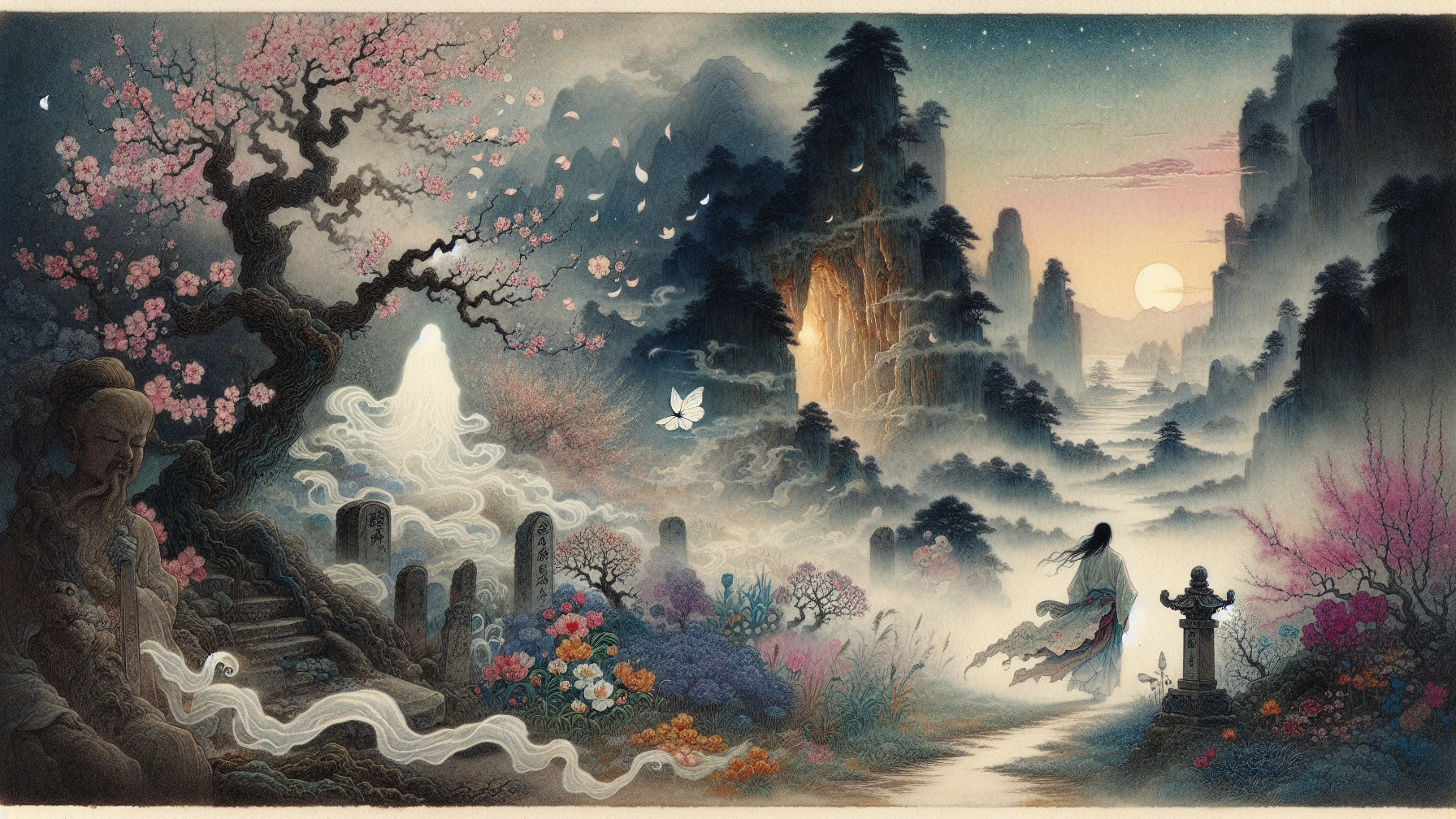 Melancholic noir watercolor-oil portrait of a muse whose posture echoes quiet music. Her robe flows like muted violin strings dissolving into shadow. Contrast of pale skin and deep ink-blue undertones, faint drifting petals like silent notes. Cinematic, emotional, fragile. No text.