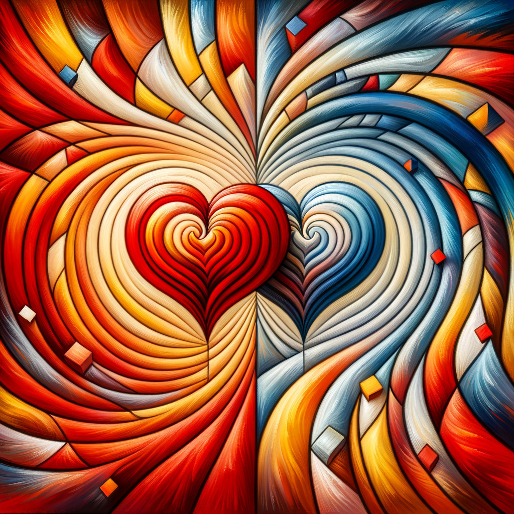 Prompt: A masterpiece of abstract spiral neo-Cubism. Two loving hearts placed side by side exude waves of emotion. Shades of red, orange, yellow, and light blue.