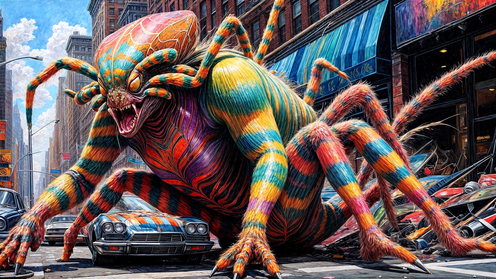 Prompt: A striking oil painting features a pastel Create an painting of A giant Hybrid creature, spider legs, woman's body, beautiful face, hairy texture destroying the New York, destruction of cars and shops, very complex and realistic details, very intricate and detailed details. showcasing vibrant colors and dramatic paint stripes. Thick layers of paint create depth, blending influences from various renowned artists. pencil sketch, Jean-Baptiste Monge