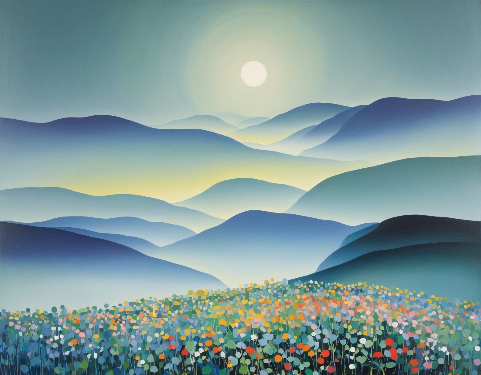Prompt: Artist Tran Nguyen, Richard Burlet and Igor Morski...A mesmerizing oil on canvas painting depicting an ethereal beautiful East Asian young woman in a flowing, elegant robe adorned with delicate floral patterns. She wears a wide-brimmed hat, her long hair billowing in the wind as she walks with a gentle, contemplative expression. Surrounding her are ethereal white doves in mid-flight, adding a sense of movement and tranquility to the composition. The background is a soft gradient of muted blues, enhancing the dreamy and serene atmosphere of the painting.