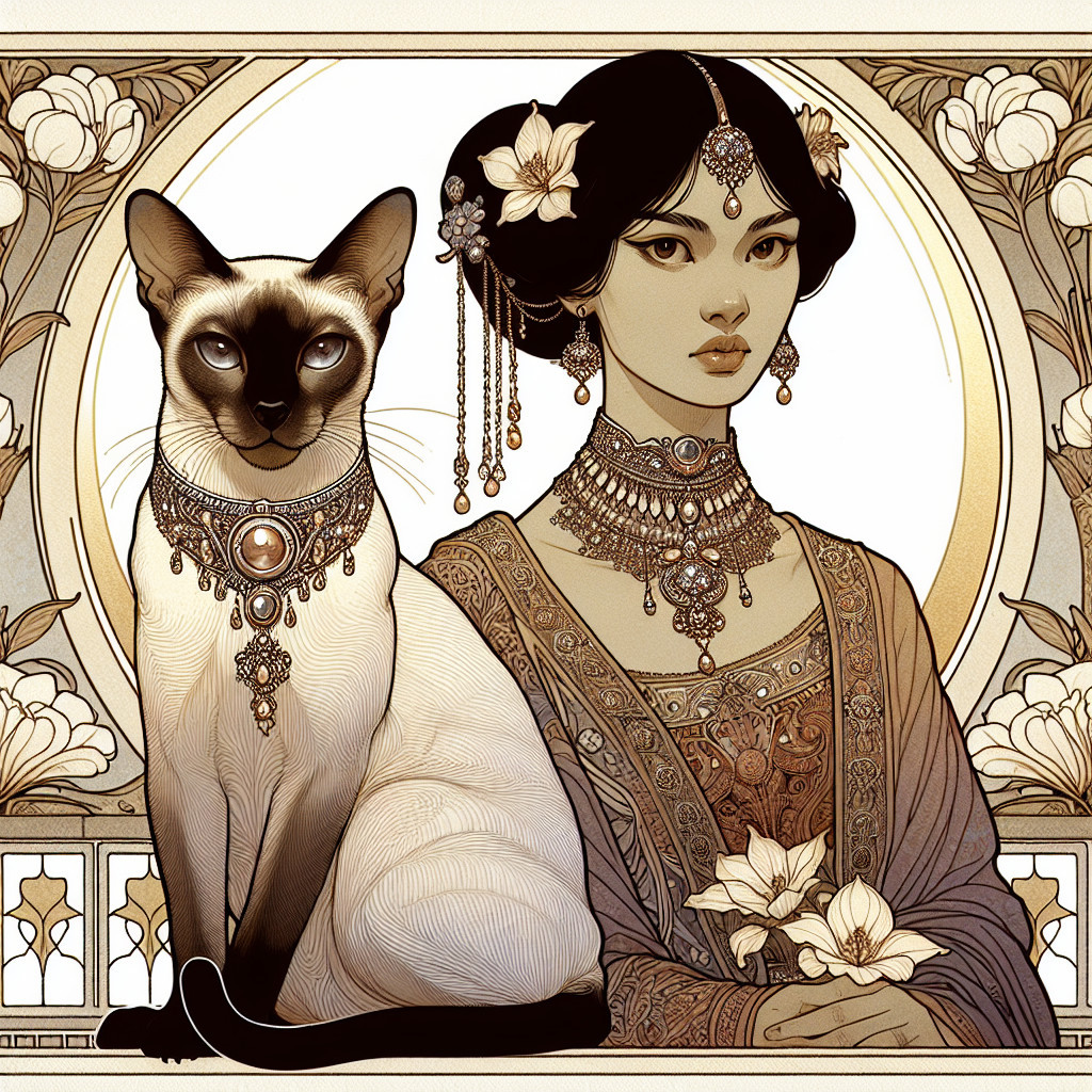 Prompt: Art Nouveau. A regal Siamese cat with elegant, flowing lines and a jeweled collar sits serenely beside its owner, a sophisticated woman adorned in a flowing, ornate gown. Both gaze directly at the viewer with an air of quiet regality. Intricate floral motifs frame the scene, soft, warm lighting, art nouveau illustration. Masterpiece, best quality, intricate details.