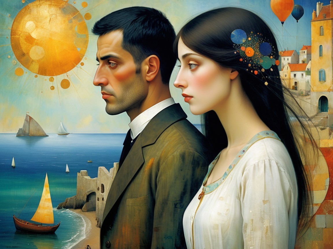 Prompt: Stunning color oil drawing on textured paper, Abstract expressionism surrealism, full-length image of In a mystical scene, a celestial angel with golden wings passionately kisses a dark, horned demon amidst a backdrop of twisting, shadowy vines, symbolizing the clash of light and darkness, amazingly powerful, a very powerful piece, Inspired by the style illustrations of Picasso, Tomasz Setowski. As if created in the patchwork style of Masamune Shirow, Catrin Welz-Stein, Satoshi Kon and Van Gogh, Mamoru Nagano