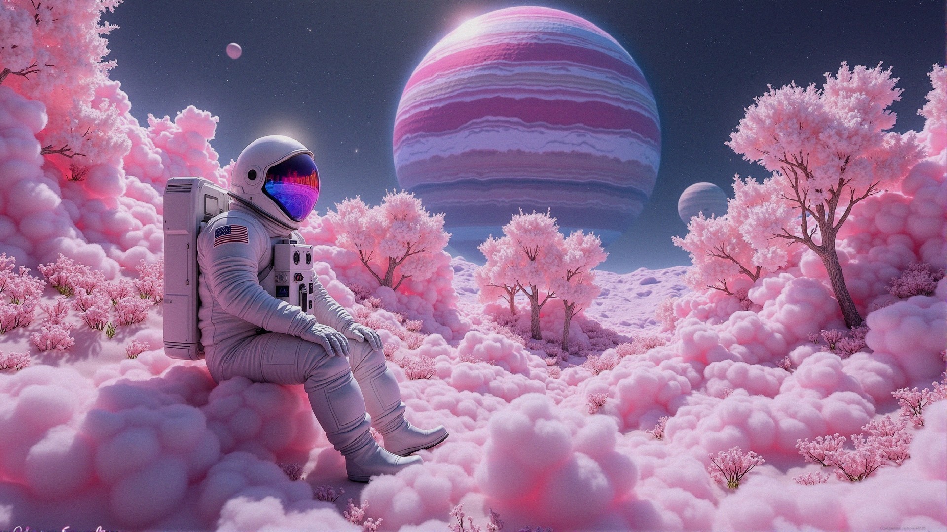 Prompt: On a vibrant cosmic scene featuring swirling galaxies in shades of teal and orange, surrounded by planets and jagged mountain formations against a deep blue sky, a distant full-length front view of a blonde 1950s space adventurer standing, wearing a tight-skin silver retro-futuristic shortsuit... Towering, spiral-shaped mountains made of iridescent stone rise into swirling skies. Gigantic, slow-moving plant-creatures drift across the horizon, their bioluminescent tendrils glowing softly. The ground is a mosaic of shimmering metals and translucent sand, reflecting strange constellations in the sky. Ultra-detailed, high contrast, dreamlike atmosphere, intricate textures, vivid colors, cinematic composition