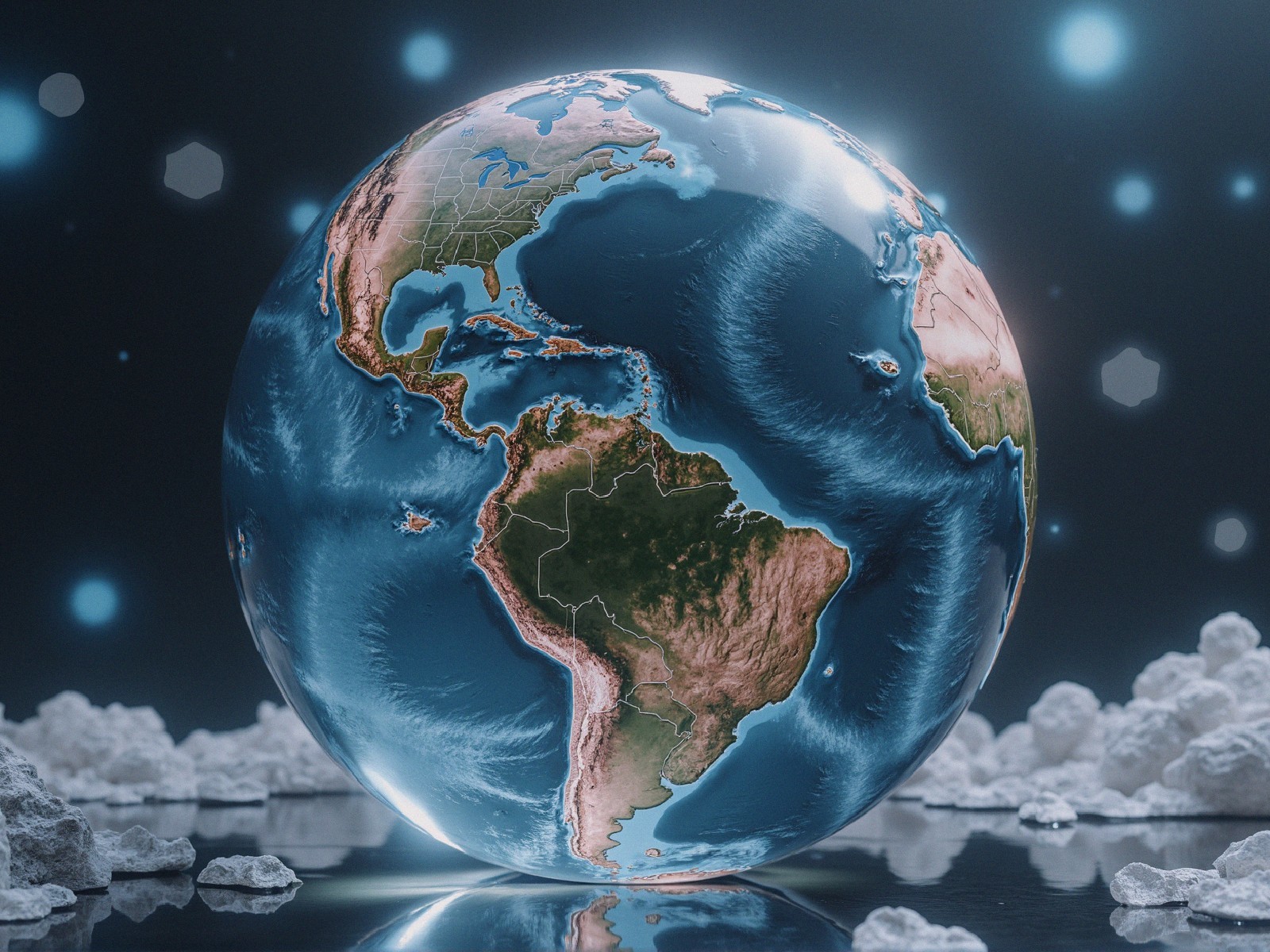 Prompt: A crystalline globe with 80% transparency, showing no borders between countries and relief with visible elevations, rivers, and lakes in natural colors. The entire American continent is visible in the foreground, with the other continents to the sides and behind.