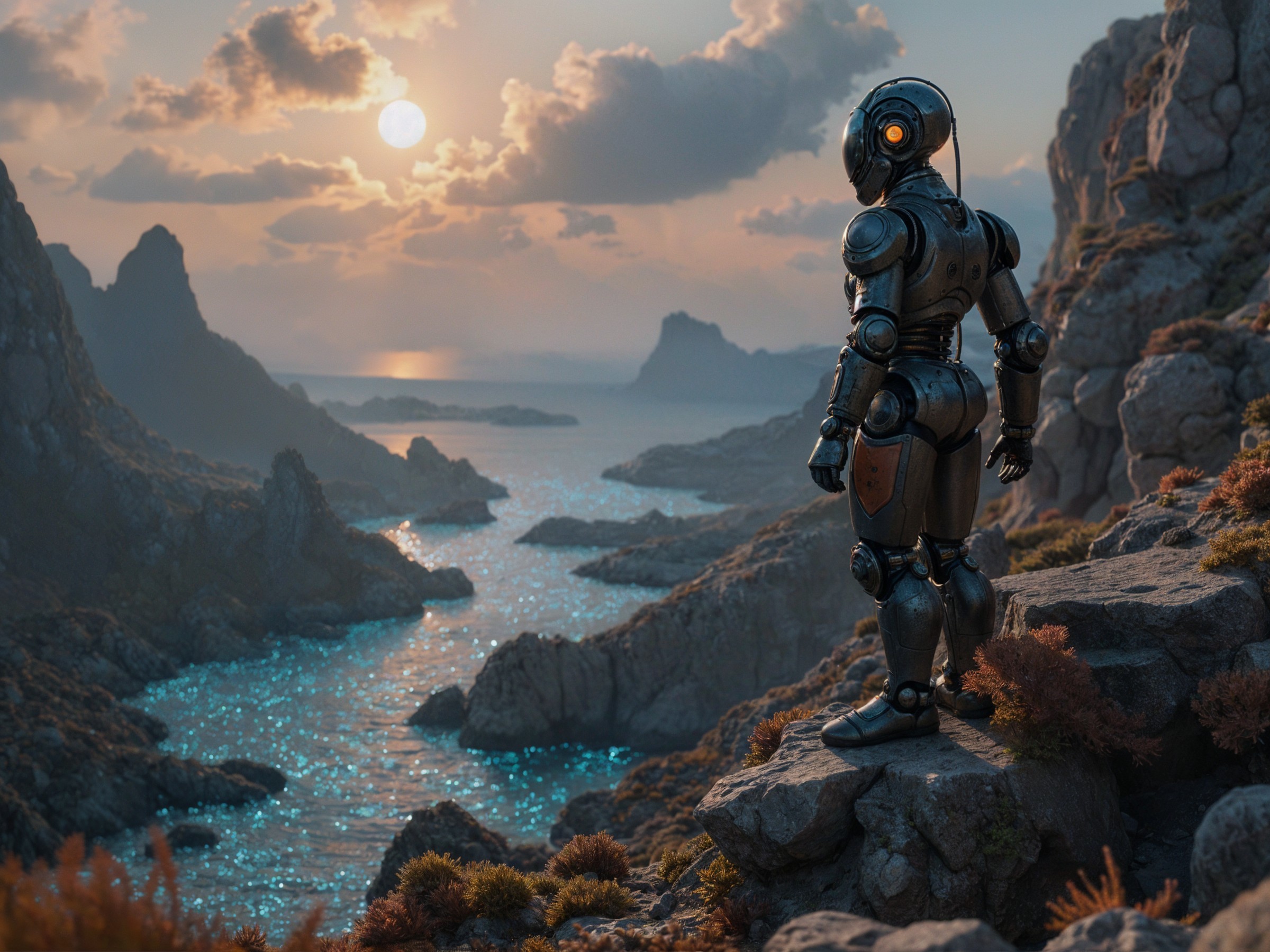 Prompt: A majestic, weathered, and intricately detailed steampunk robot explorer stands on the precipice of a vast, alien ocean under a sky with twin suns. Shimmering coral reefs teem with bioluminescent life below, starkly contrasting the cold, mechanical explorer. The scene is rendered in hyper-realistic detail, capturing the grit of the metal and the fluidity of the water. Photorealistic concept art style, inspired by the atmospheric environments of Simon Stålenhag, the detailed landscapes of Ansel Adams, and embodying the adventurous spirit of Jules Verne. Golden hour lighting, vivid bioluminescence, and a cinematic wide-angle lens enhance the dramatic vista.