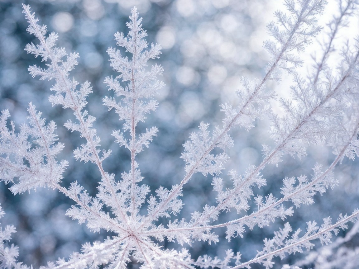 Prompt: A winter window is covered with delicate ice flowers. In the centre, filigree, feather-like crystals grow, refracting the light into small colours. Frosty tendrils like leaves or pine branches run along the edge. Subdued daylight illuminates the patterns, and the snow-covered outside world shimmers through thin spots. Dense and light frost zones alternate, interspersed with tiny enclosed air bubbles. The window thus becomes a short-lived work of art that forms new shapes with each winter day.