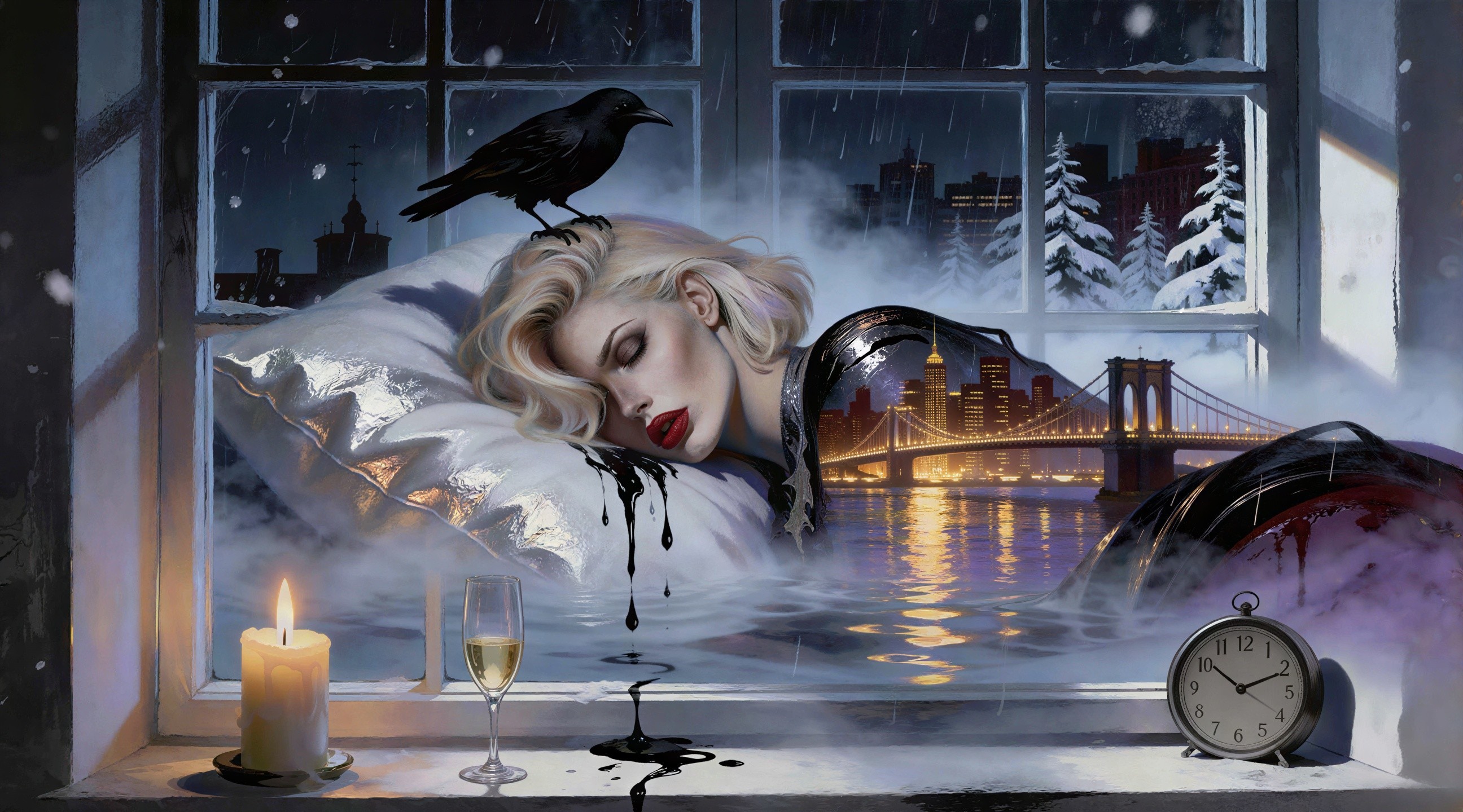 Prompt: surreal gothic romantic painting — “The City Dream”. A beautiful blonde with a short bob and scarlet lips sleeps in a sea of silver mist while the glowing city skyline and bridges emerge through her dreams. Her face and the city merge in a double exposure of reflections, rain, and light. Black ink tears drip down like city rain. A raven hovers above her pillow as a dream messenger. Palette-knife acrylic textures, silver and copper foil, dripping black and crimson ink, fog and glass reflections. The mood is melancholic and mystical — between sleep and memory, love and solitude. Krinichka Aesthetic, ultra-detailed, cinematic lighting, trending on ArtStation.