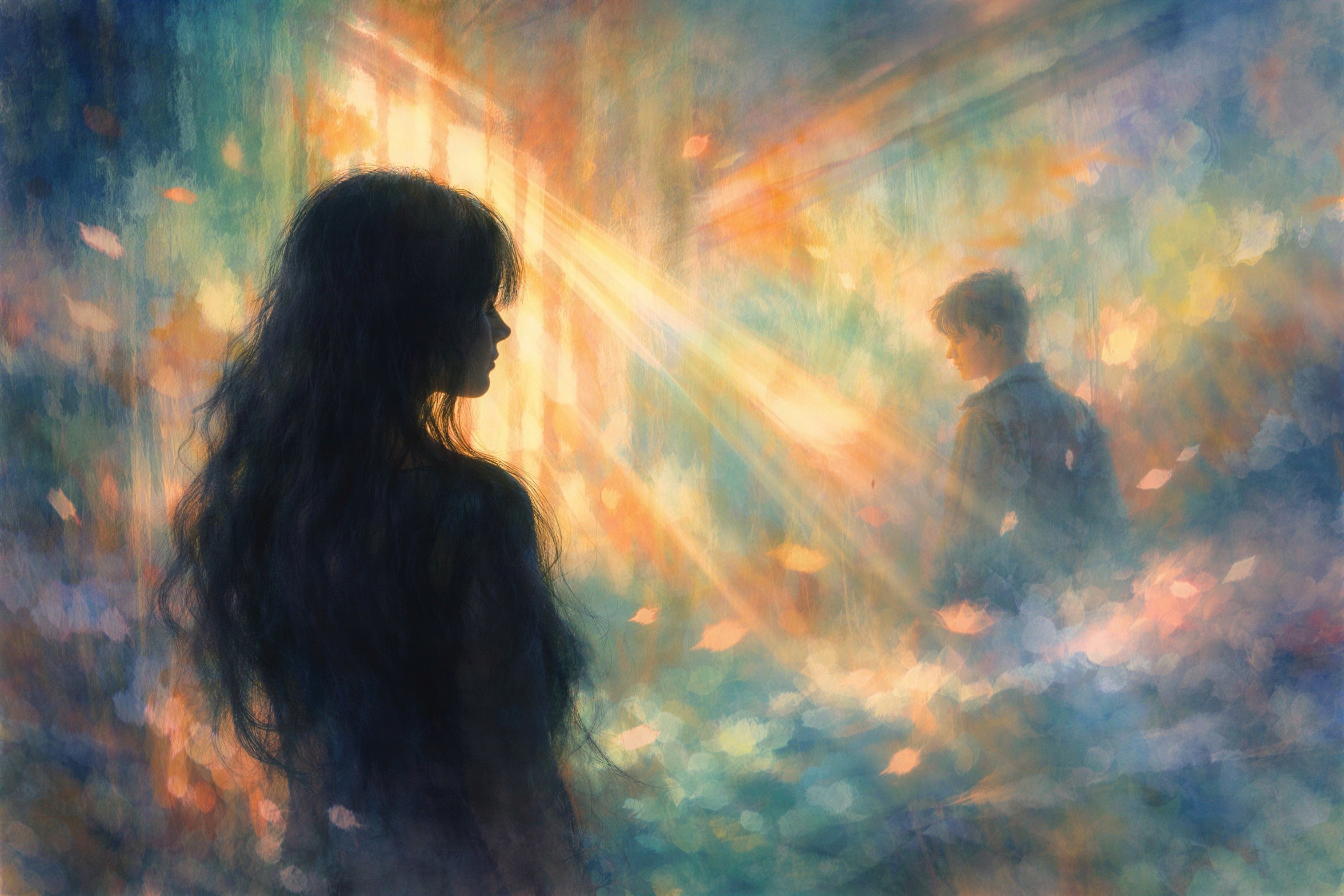 Prompt: A moody, atmospheric scene featuring a silhouette of a long haired young woman standing against a vibrant, colorful background illuminated by natural light. The setting has an eerie yet beautiful quality, with soft shadows and light rays creating a dramatic play of colors on the walls. In the background, another figure of a young man is partially visible, adding a sense of depth and intrigue to the composition. The melancholic tone is ethereal and mysterious, with a blend of blues, greens, and warm colors.
