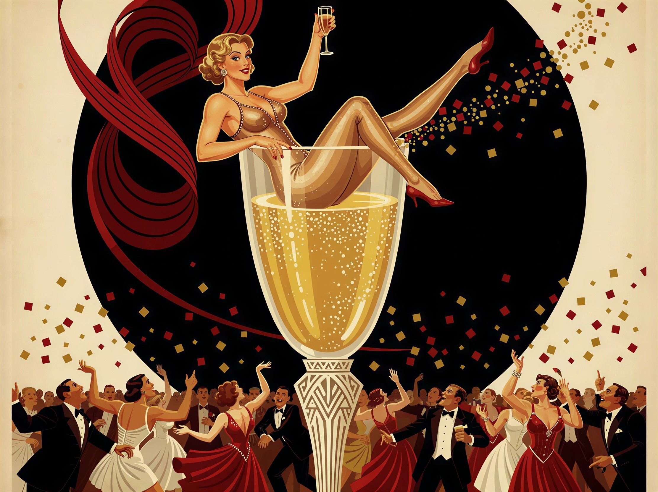 Prompt: Surrealism; A Hypnotic New Years Tale, Colorful Psychedelic art-Nouveau with emphasize on grace. hyperbolic-geometry-outdoors with sensuel doppler-effect movements.