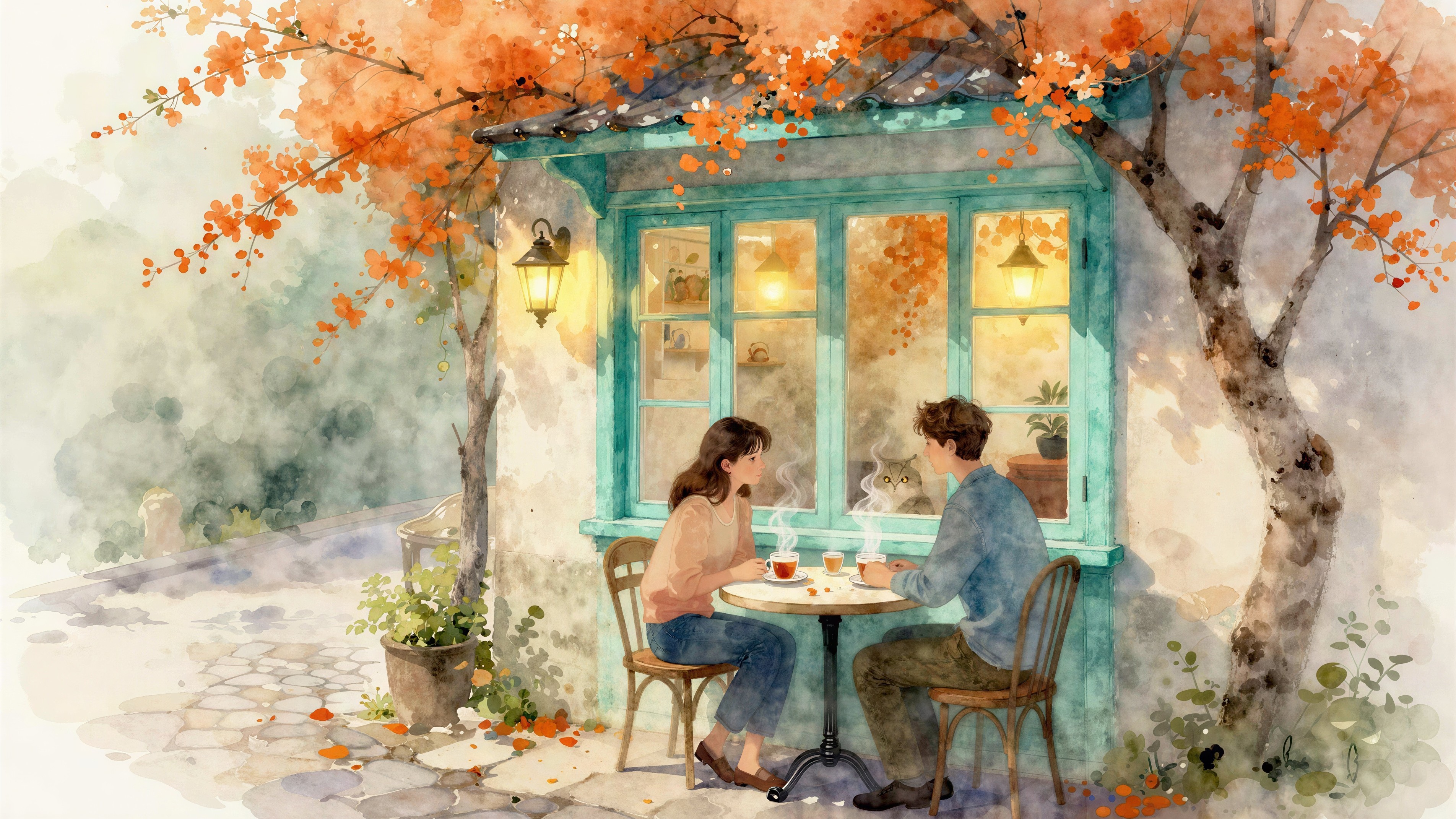Prompt: Dreamy hazy breezy watercolor, wet-on-wet technique, a secret café hidden in a quiet alley, turquoise wooden windows glowing in lantern light, orange trees in bloom leaning over cobblestones, two young lovers seated at a small round table near the window, steam curling from cups of tea, a curious cat resting nearby with eyes that seem to know their names, petals scattered across the table, loose water effects, minimal paints, pastel turquoise, amber, and orange blossom tones, golden ratio composition, romantic intimacy, impressionistic EmmAI storytelling.