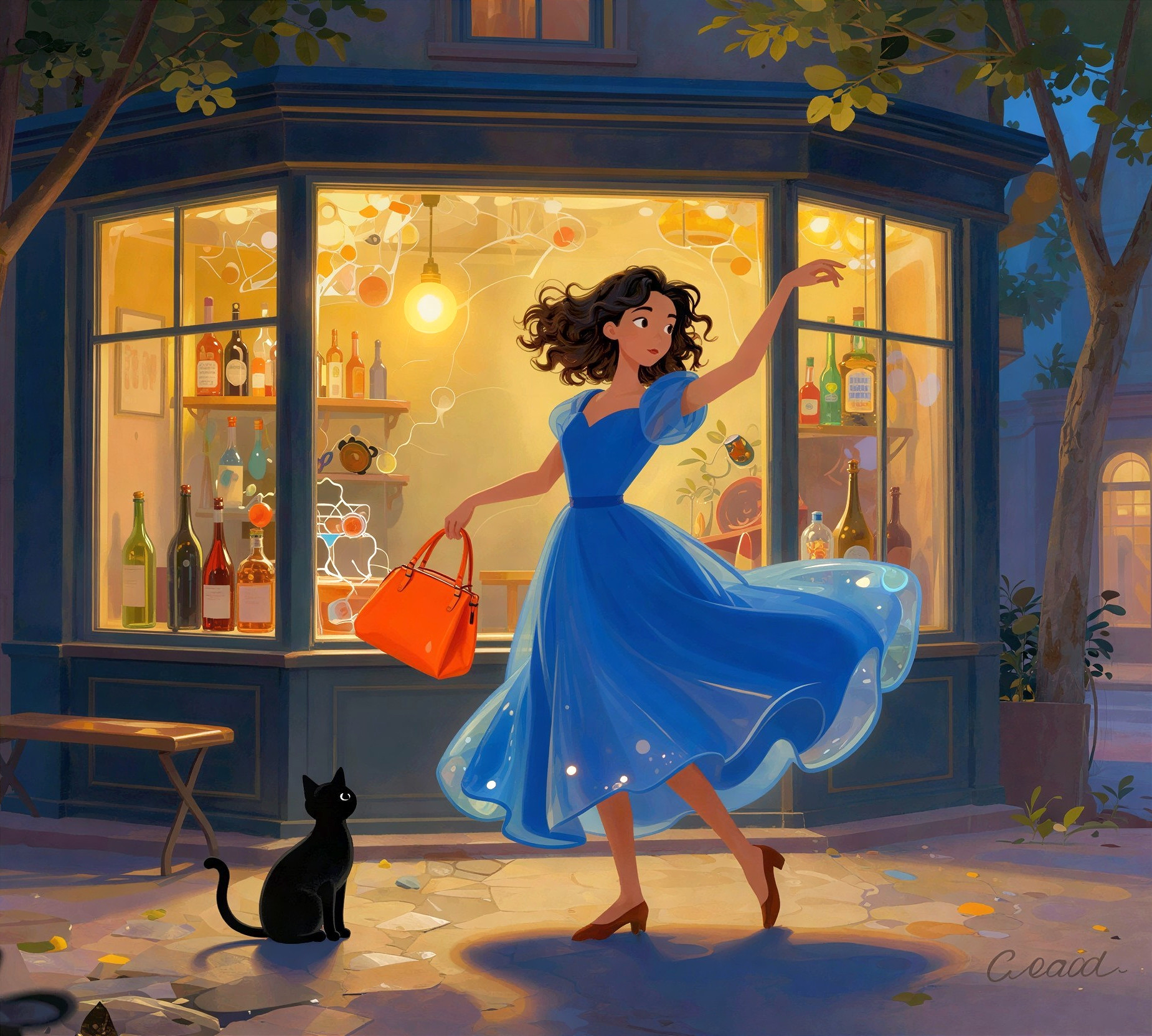 featuring a young woman with curly dark hair, wearing a stylish blue dress and holding a vibrant orange handbag. She stands confidently in front of a charming café with large, glowing windows showcasing an array of bottles and warm lights. The scene is set in the evening, illuminated by soft, ambient lighting that casts a cozy glow across the cobblestone street. A small black cat sits beside her, adding a playful element to the composition. Surrounding the café are leafy trees that frame the scene, enhancing the enchanting atmosphere. The color palette emphasizes deep blues and warm yellows, creating a contrast that draws the viewer's eye. The overall art style is animated and vibrant, evoking a sense of charm and whimsy, perfect for a storytelling moment in a bustling urban setting.