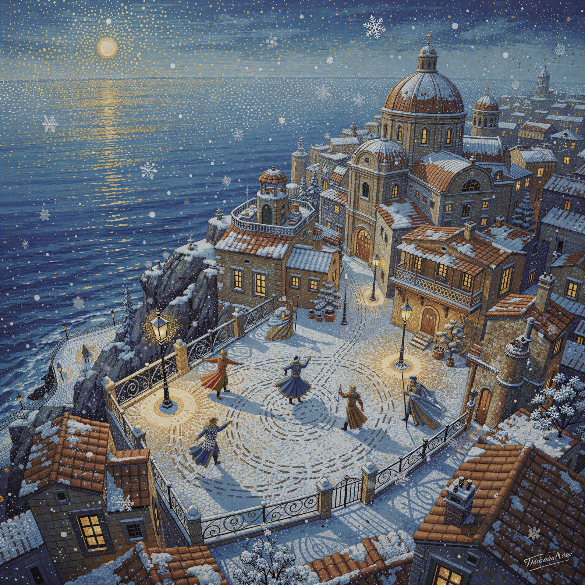 Prompt: A painting entirely composed of colored dots covering the entire canvas. A landscape seen from above depicting a snow-covered Mediterranean city. Figures play in the snow. Reflections and light in the snowflakes. Dominant colors: blue and gold. Contrasts