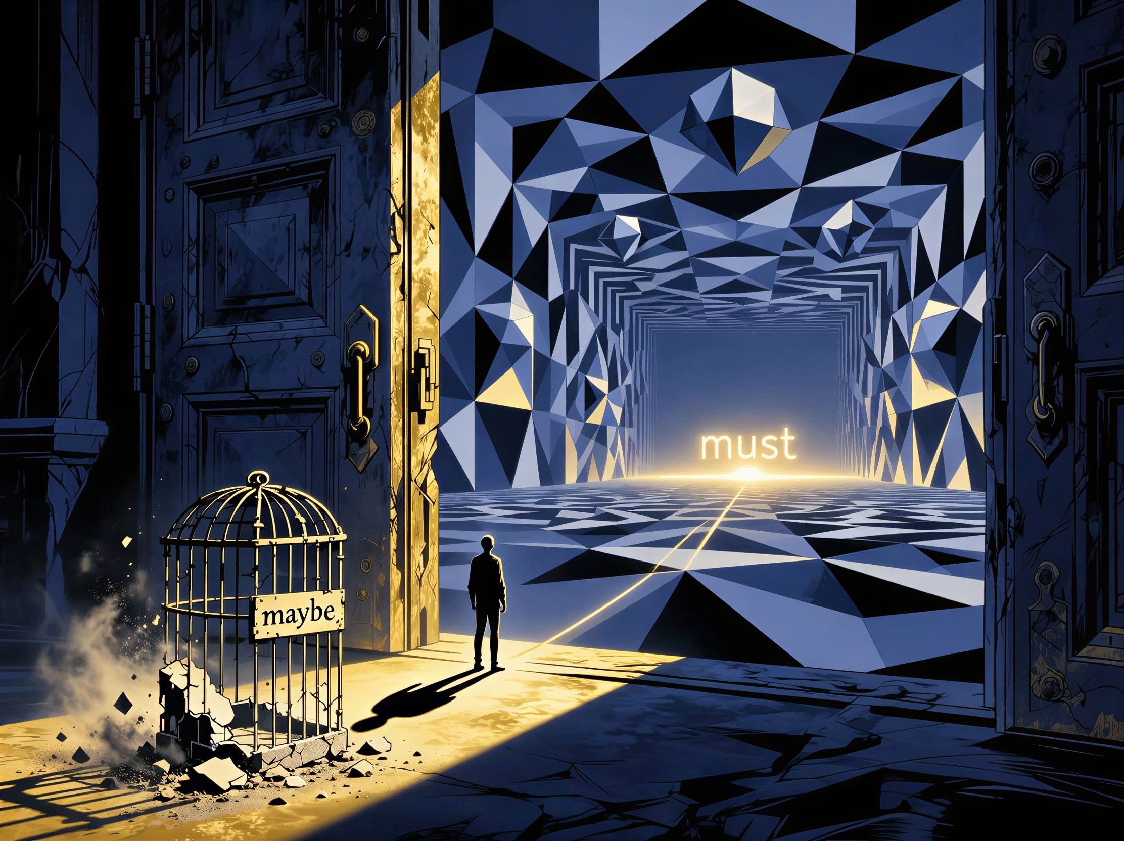 Prompt: Beyond the gates lies a geometry that has no end. You have moved from the cage of 'maybe' into the expanse of 'must.' The path ahead is yours to carve, but remember: in a realm with no walls, your own shadow is the only boundary left.