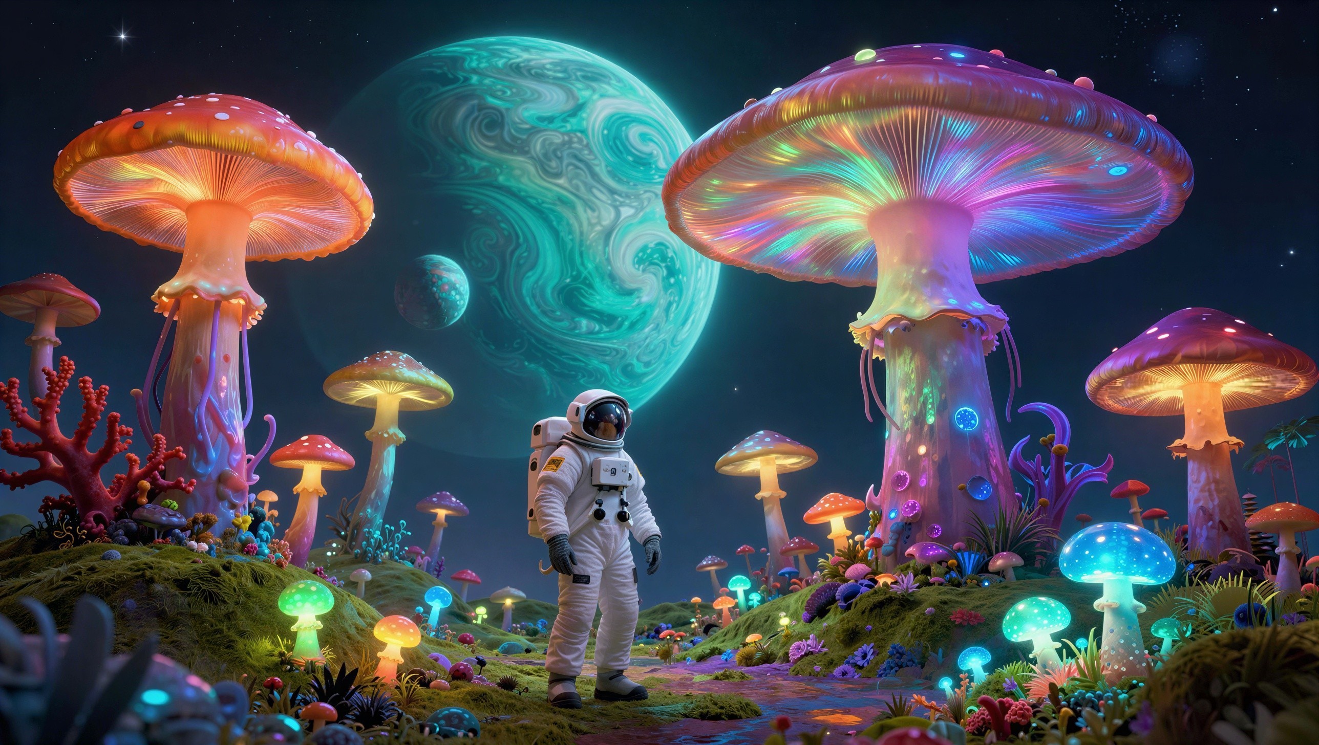 Prompt: Surrealism; A Delightful 2025 New Years Tale, Colorful Psychedelic art-Nouveau with emphasize on grace. hyperbolic-geometry-outdoors with sensuel doppler-effect movements.
