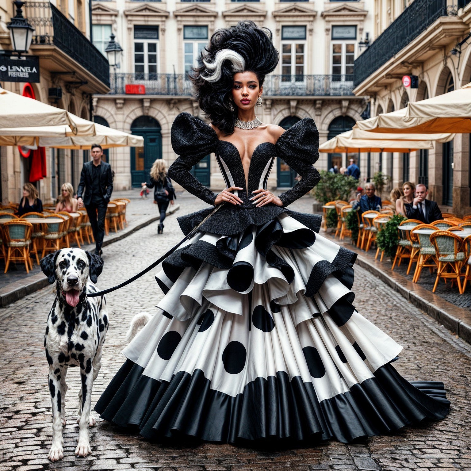 Prompt: A stylish woman in an extravagant black and white gown with large polka dots and dramatic ruffles walks confidently down a cobblestone street, accompanied by a playful Dalmatian dog. The background features charming Parisian architecture with outdoor cafés, and the scene is bustling with people in stylish attire, capturing a vibrant urban atmosphere. The model's striking hairstyle features bold black and white colors, adding to her high-fashion presence. The overall mood is chic and dynamic, blending high fashion with everyday city life.