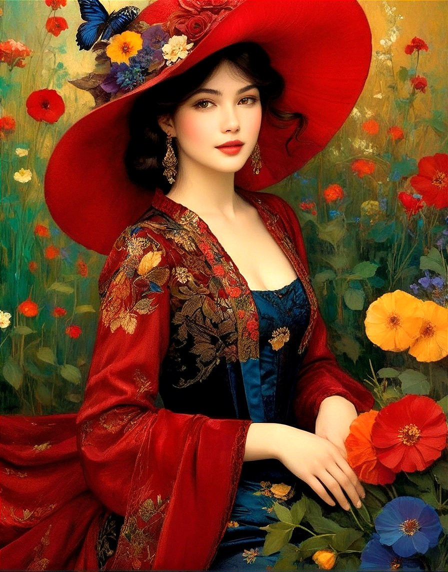 Prompt: Create an image of a young woman with a graceful and serene expression. She has a light skin tone and delicate facial features, including soft, full lips and slightly almond-shaped eyes that convey depth. Her hair is dark, elegantly styled in soft waves, and she wears a striking, oversized red hat decorated with flowers and a butterfly, enhancing her enchanting presence.