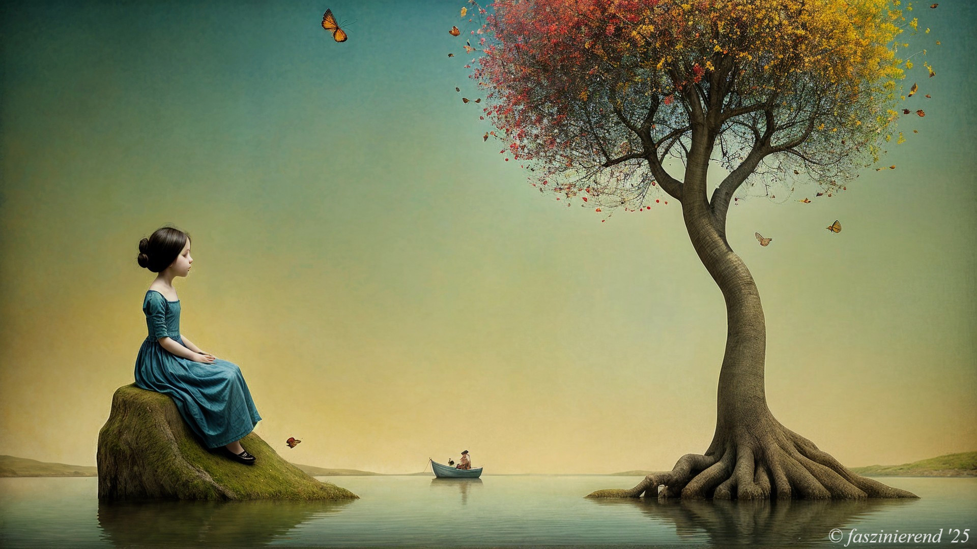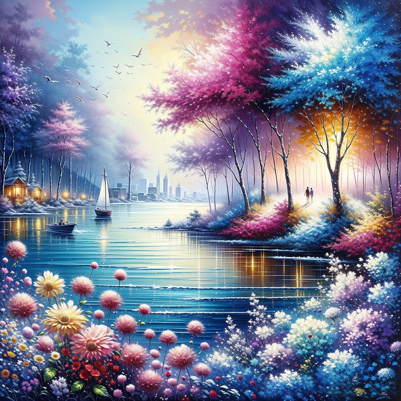Prompt: A captivating oil on canvas painting depicting a serene, pristine lake shimmering with hues of blue and purple, bordered by a shoreline adorned with strikingly vibrant trees displaying shades of blue, pink, red, and white. Scattered across the foreground are delicate flowers rendered in a mesmerizing pointillist style, echoing the vibrant color palette, while a lone cyclist is seen from behind, their silhouette a subtle focal point alongside a gently moored sailboat near the shore. The background softly fades into blurred shadows of distant buildings, bathed in warm, golden light, creating an atmosphere of tranquil beauty and gentle movement with a few birds in flight.