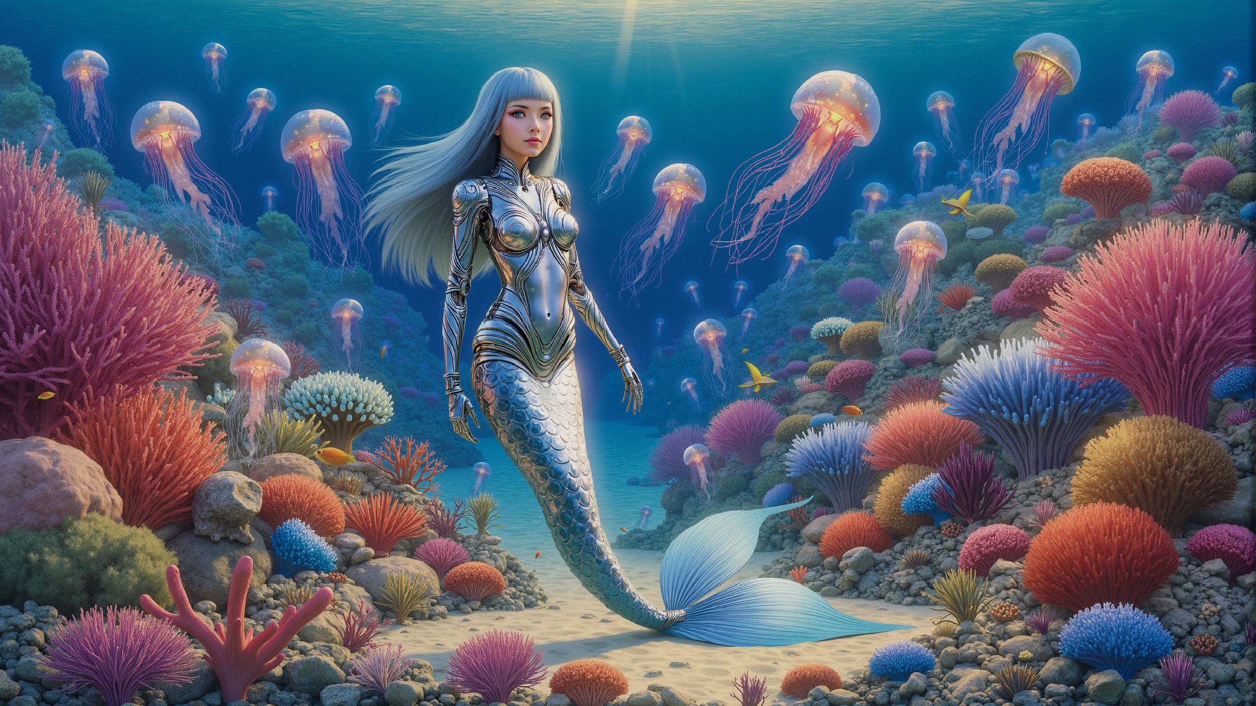 Prompt: A masterpiece of fantasy realism with elements of sci-fi. An underwater landscape. Picturesque corals, seashells, and marine plants grace the seabed. Foreground: A beautiful android mermaid made of silver metal and light blue plastic slowly swims underwater. The android mermaid has a beautiful, feminine body. She has long, light pink hair and a beautiful fishtail made of shiny silver metal scales. A carefree smile graces her beautiful light blue plastic face. Medium: A school of small biomechanical fish made of golden metal and red plastic swims nearby. Background: Further ahead, two translucent biomechanical jellyfish are visible, each with a thin electronic core and glowing multicolored diodes inside their soft, translucent bodies. Occasional air bubbles are visible in the water. Reflections of sunlight are visible on the surface of the water. High level of detail. High quality lighting, shadows, and reflections.